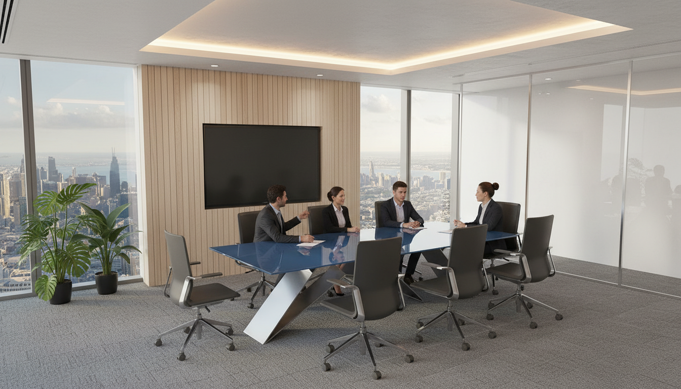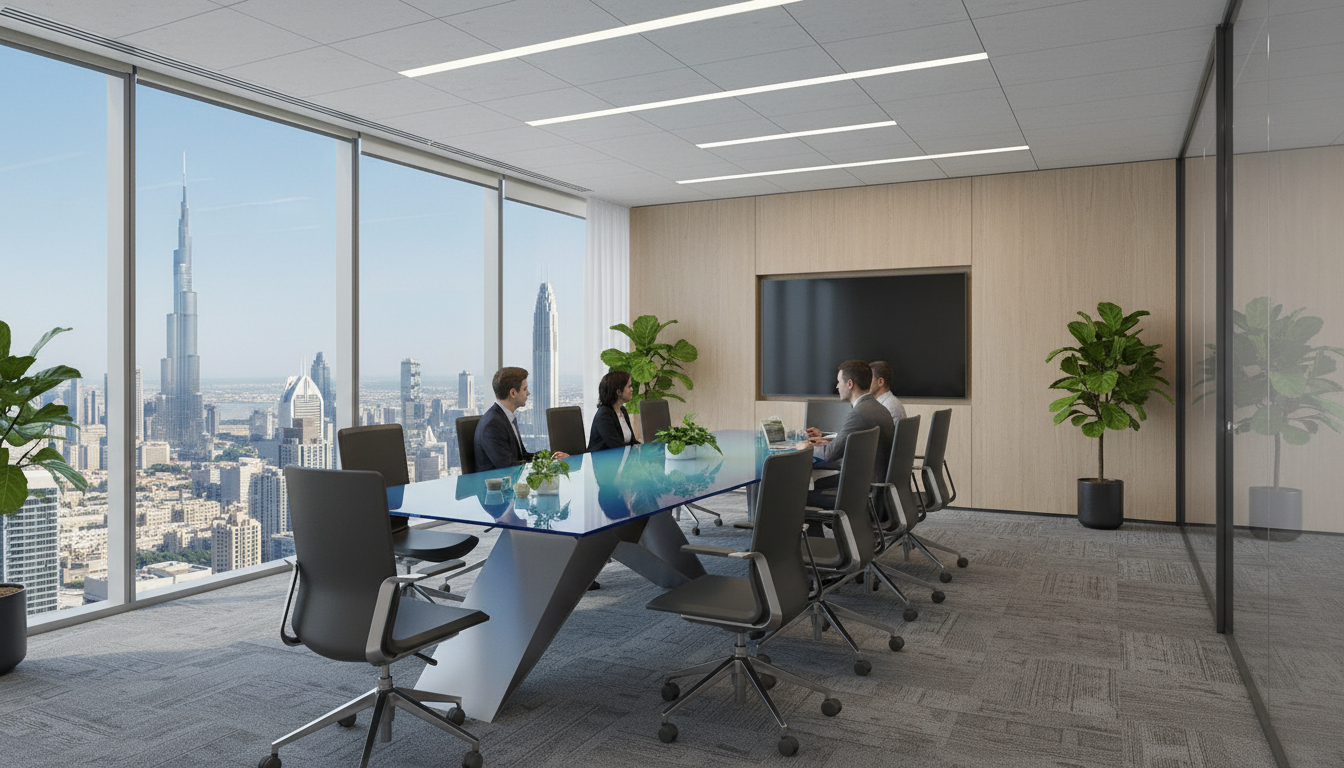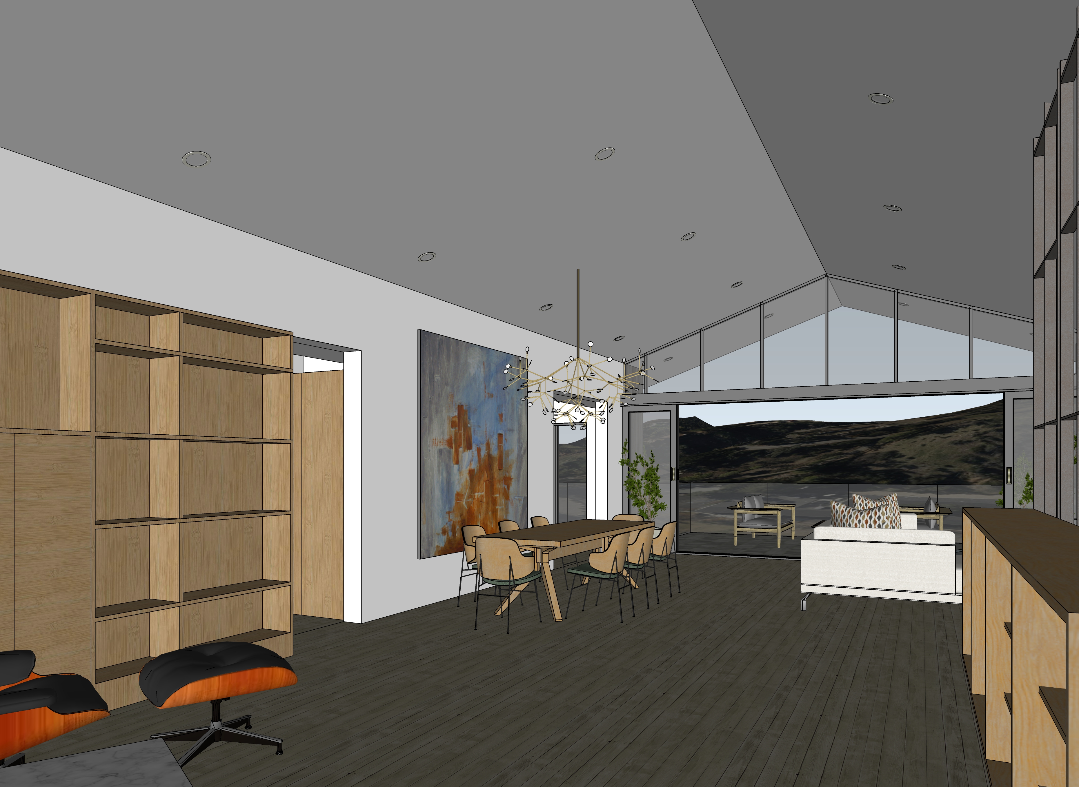 evening view with some low light over the landscape and distant hills recessed lights on above from the ceiling lights turned on the chandelier above the dining table add a floral arrangement on the dining table and plates silverware and wine glasses also on the dining room table add two people sitting on the sofa add books and accessories to the shelves on the left side of the view add similar books and accessories to the shelving cabinet on the right side of the view add a man and a woman standing out side on the balcony facing out towards the hills beyond add a floor rug under the eames chair and ottoman add a floor rug under the sofa
