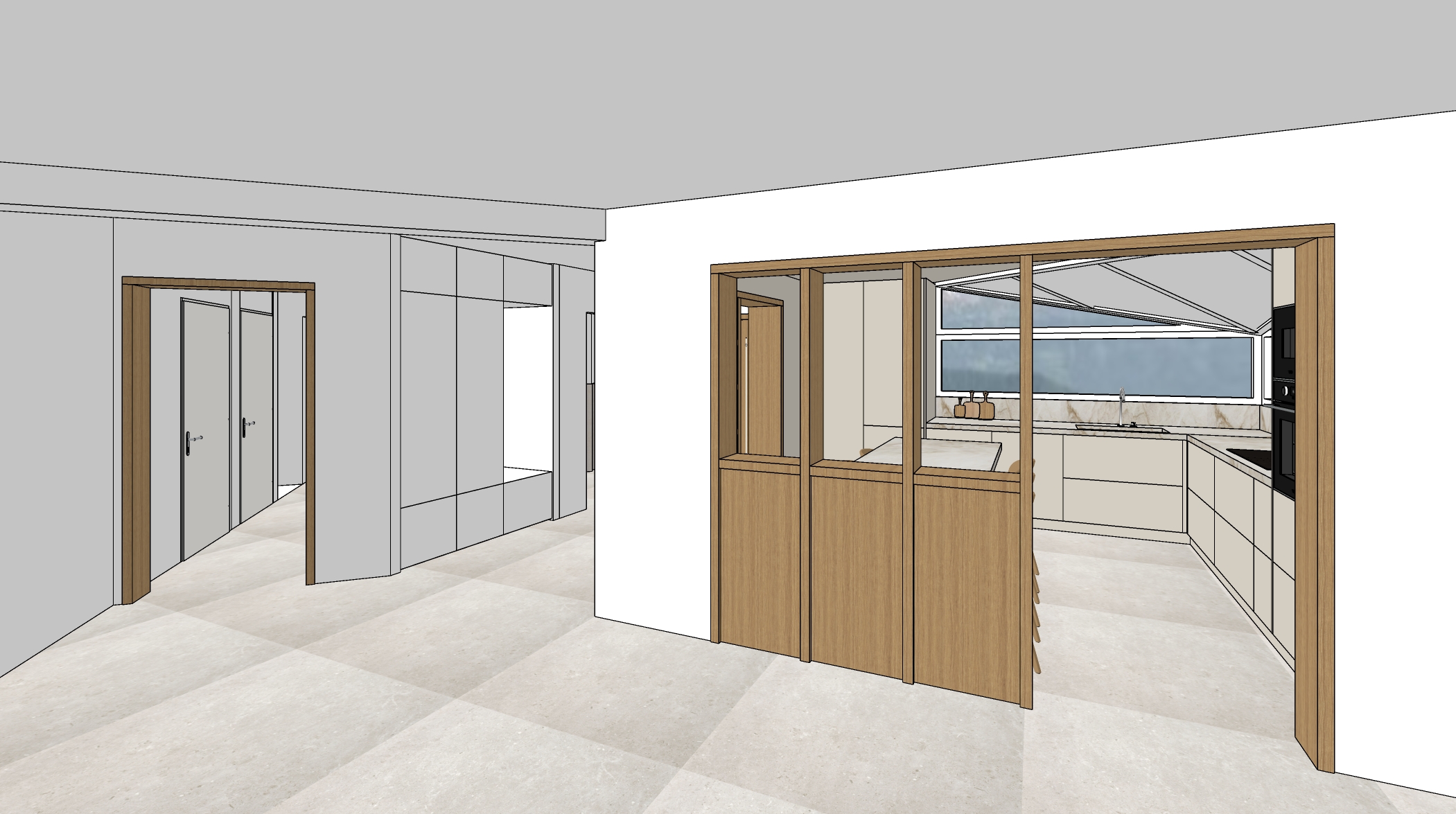 cuisine avec fa ades lisses et non brillantes de couleur beige clair plan de travail en quartzite perla venata sol en travertin paysage montagne
