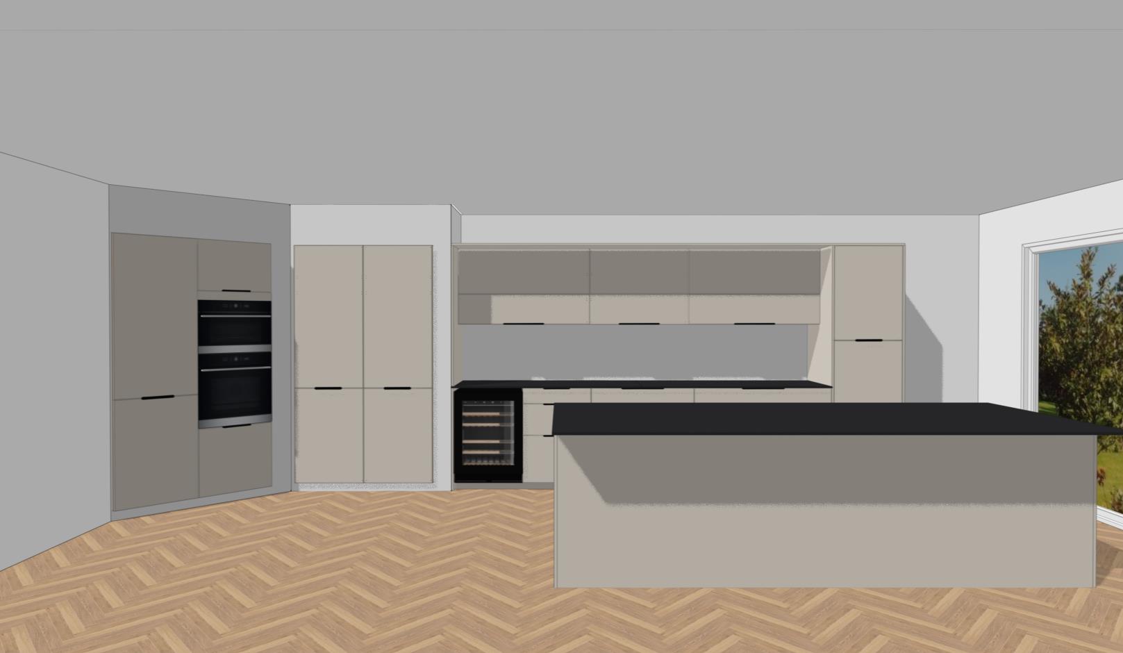 ajoute de l clairage sous les meubles hauts ajoute une table manger rectangulaire moderne en bois sur la gauche de l ilot avec des chaises et de la d coration ajoute des tabourets devant l ilot n ajoute rien sur l ilot