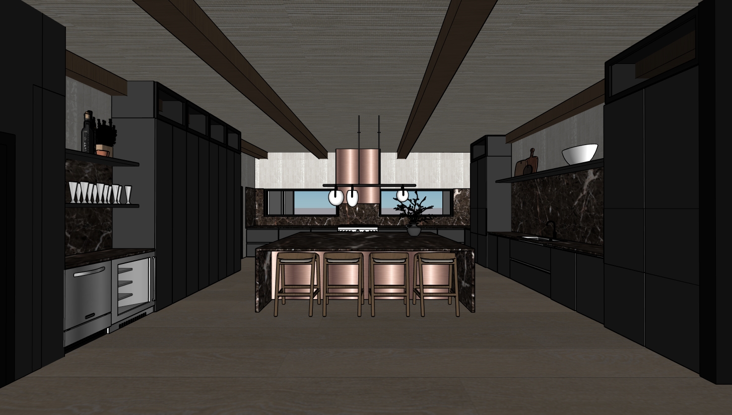 modern kitchen light wood floors rustic wood beams on the ceiling with grass cloth wallcovering in between charcoal dark cabinetry rustic copper rectangle hood modern glowing pendant above island dark dramatic countertops dark marble backsplash dramatic same as countertops under cabinet lighting cove lighting under toe kick woods out the windows white tile on upper part of walls recessed can lights bright interior under island lighting