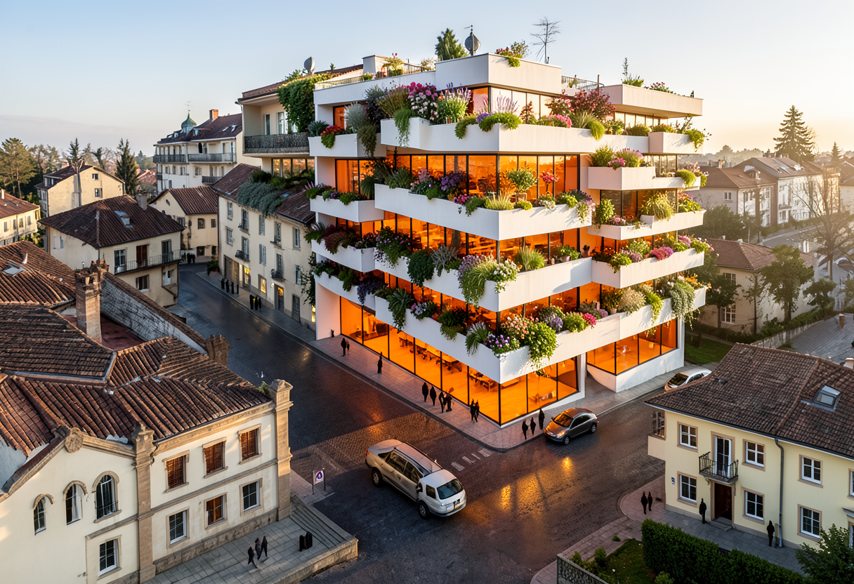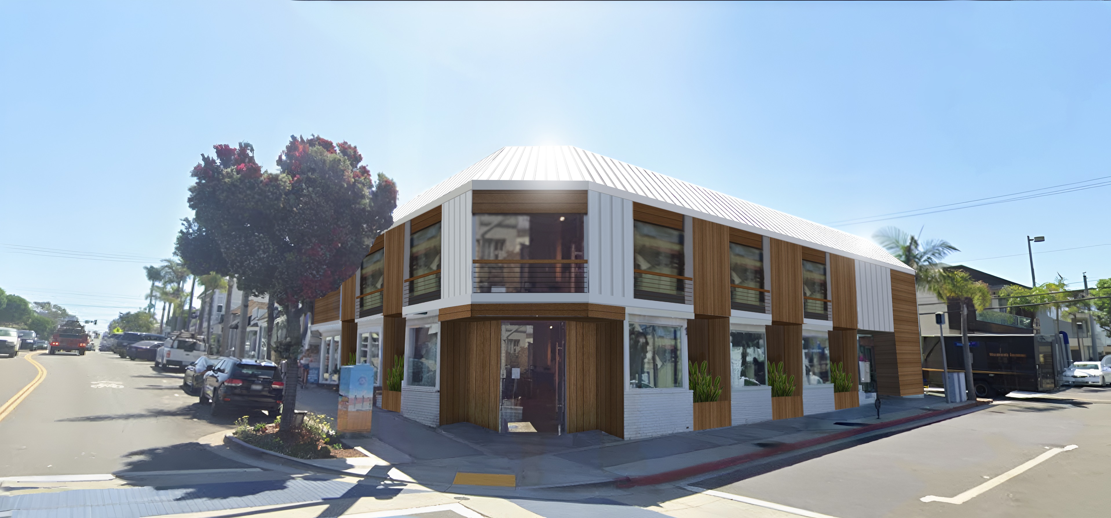 please change the lower floor brick work to match the white standing seam steel siding of the second floor add more planters and wood accent pieces