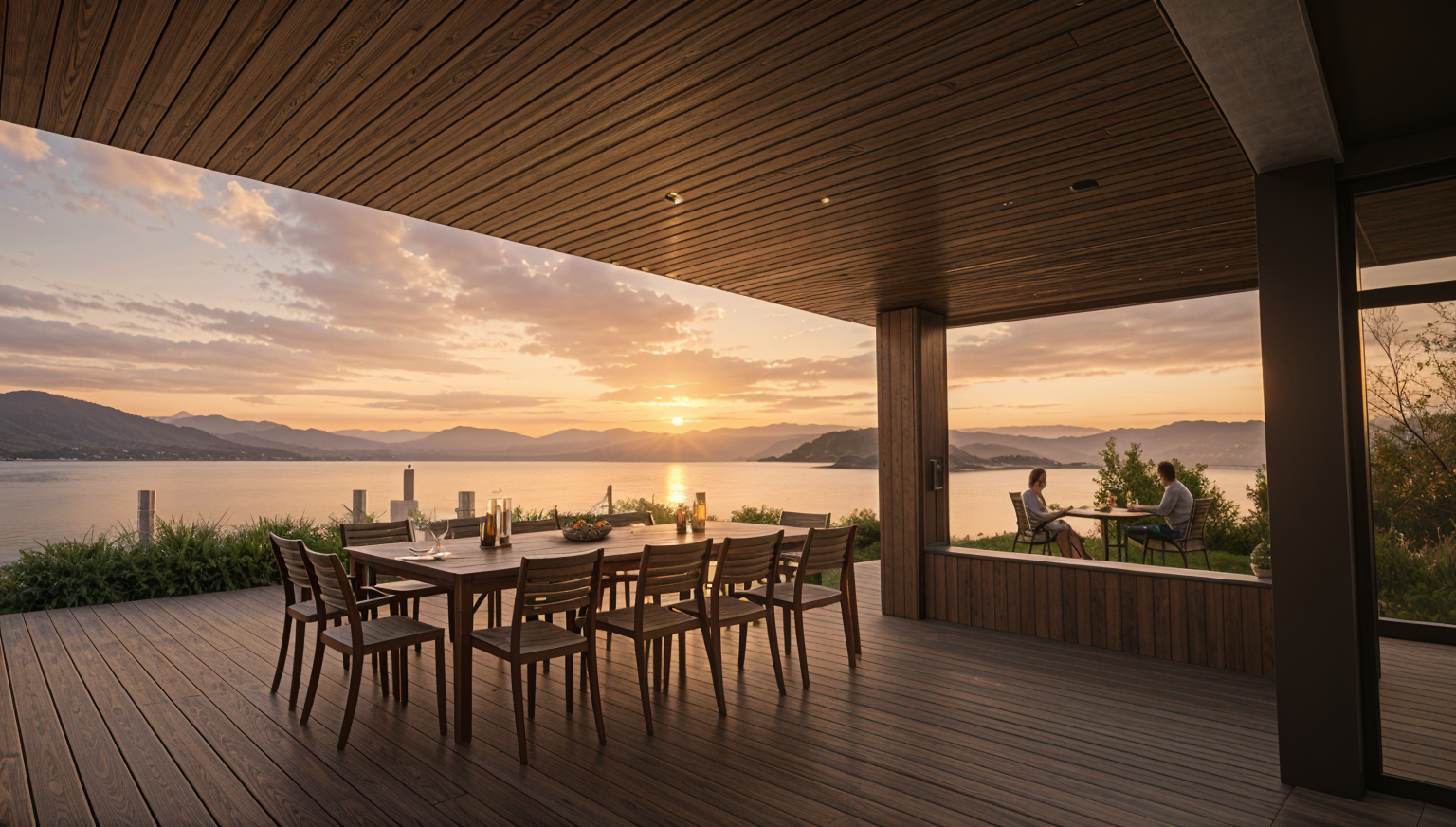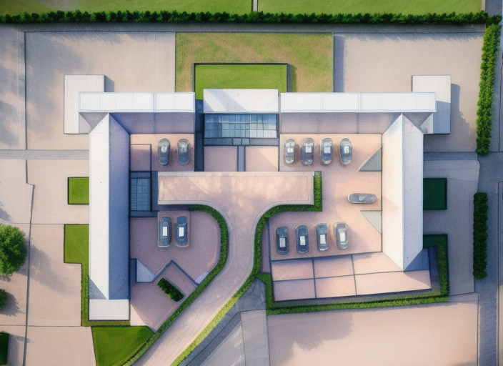 render a barn style architectural design from a top down view featuring a sleek minimalist building complex use a palette of soft reds and browns light gray for the buildings to emphasize modernity and incorporate deep green for the natural elements such as surrounding trees and grass add a subtle texture to the parking spaces in a muted asphalt gray populate the parking area with cars in shades of silver and black for contrast the atmosphere should be serene and professional with a touch of luxury watercolour effect overall