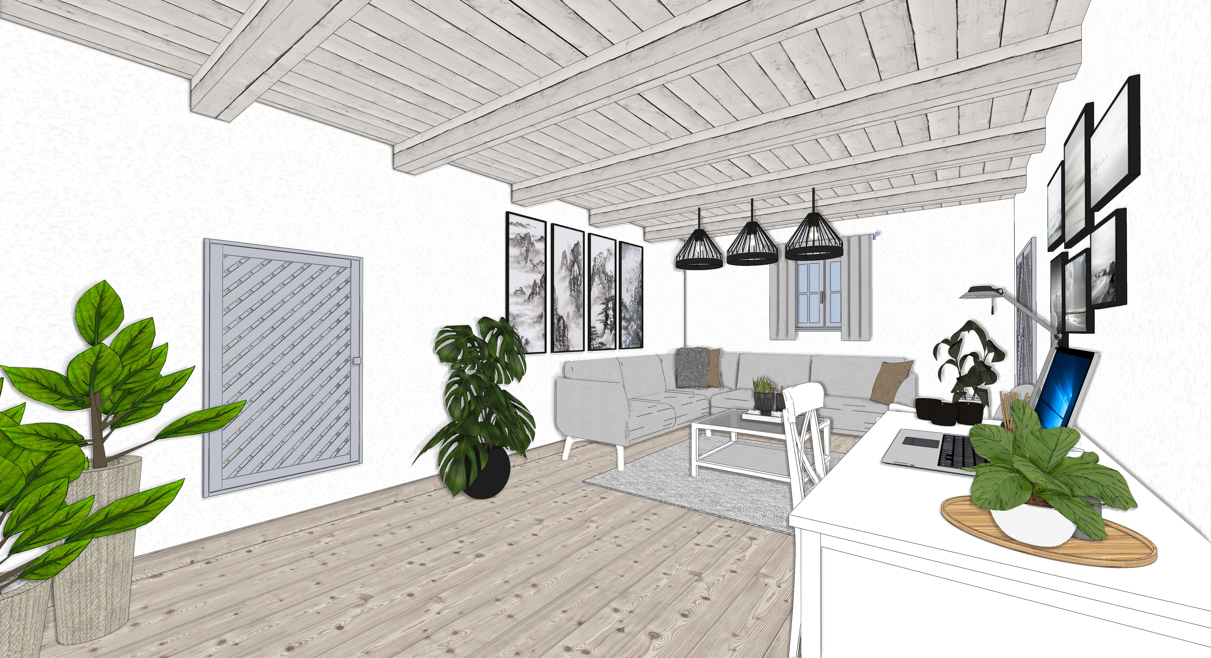 create a cozy and modern living room setting with a scandinavian design render a room with light gray walls and a textured white wooden ceiling perfectly illuminated with soft warm lighting incorporate a light gray sectional sofa with plush beige and charcoal throw pillows complement this with a sleek glass coffee table on a subtle gray rug highlight the room s natural elements with lush green plants like a monstera design an elegant workspace featuring a white writing desk and chair add personality with black framed monochrome landscape photographs on the wall choose soft natural wood for the flooring enhance the ambiance with three black pendant lights hanging from the ceiling casting a gentle glow add a touch of technology with a laptop on the desk and maintain a serene atmosphere throughout