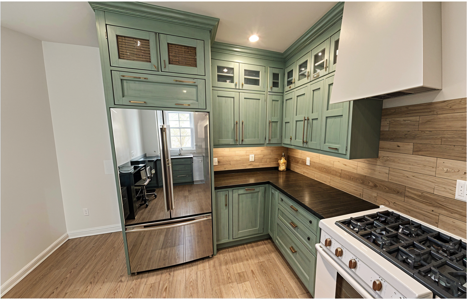 do not change the cabinets in any way preserve the exact cabinet colors materials finishes dimensions door and drawer styles hardware spacing alignment and all geometry exactly as shown do not alter the countertop shape backsplash appliances flooring lighting fixtures or wall structure only remove the construction materials clutter and mess from the scene clean the room and make it look finished and staged add a few simple tasteful home accessories appropriate for the style of the space but do not add or remove any furniture windows or architectural elements maintain the original lighting direction and realism enhance clarity and polish the photo while keeping the cabinetry and room design completely unchanged do not alter the lighting to keep the cabinet colors as they are in the image add new flooring stage the countertops for a kitchen do not change anything about the cabinets add a subzero stainless fridge in the opening on the right