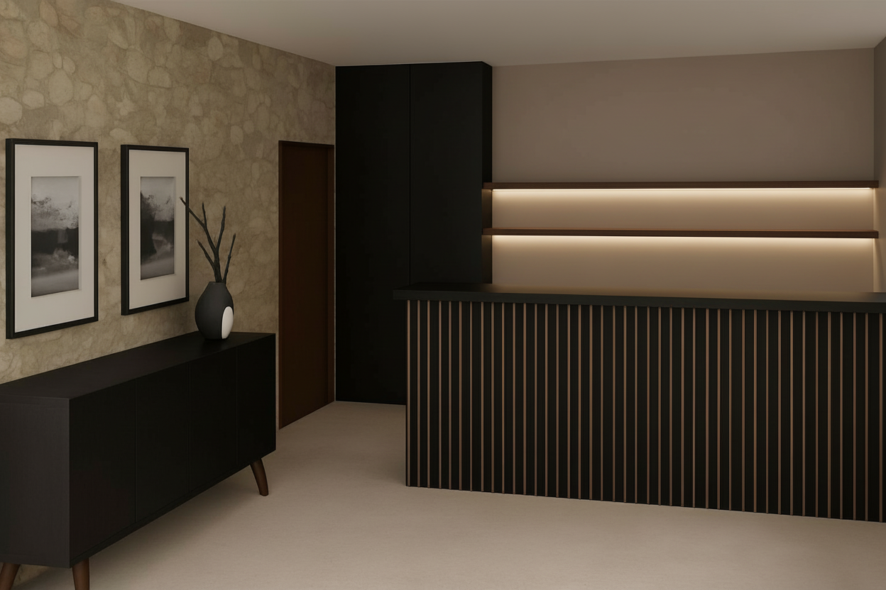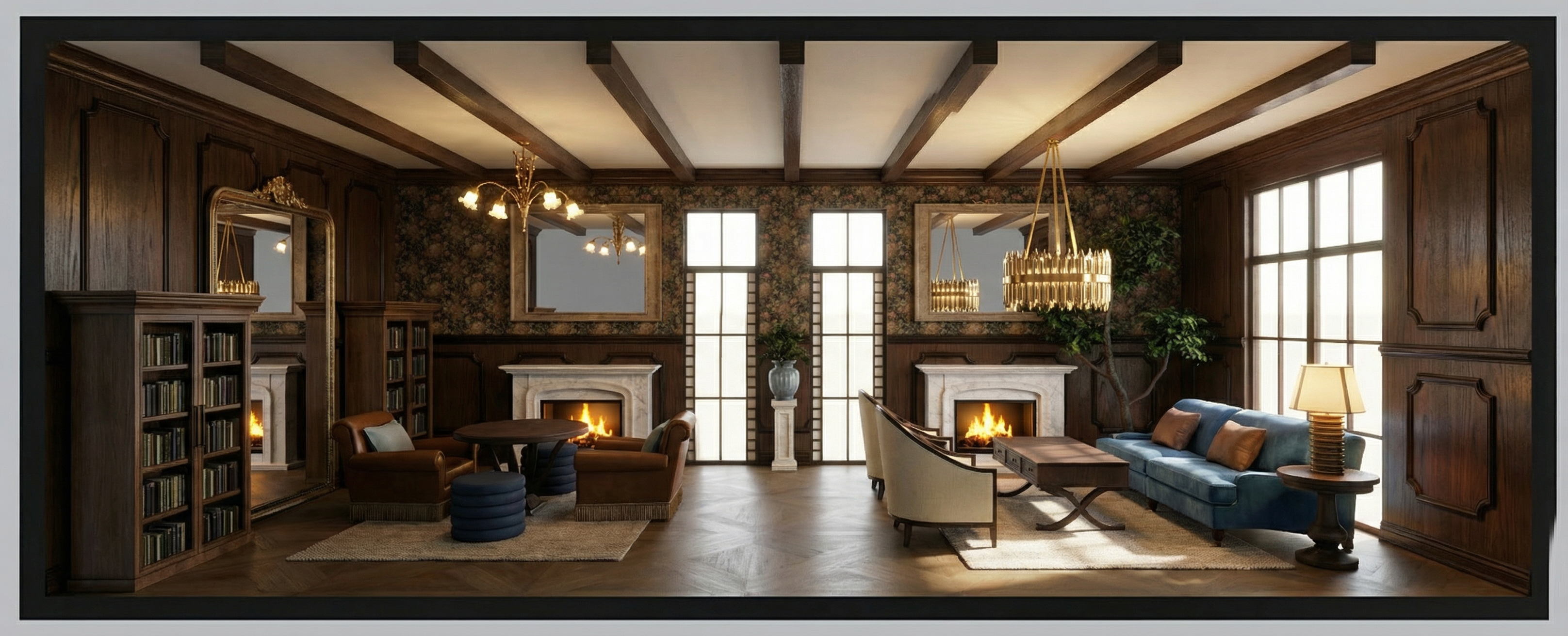 bronzo mirror on the wall behind shelves commode on left wall in wallnut wood