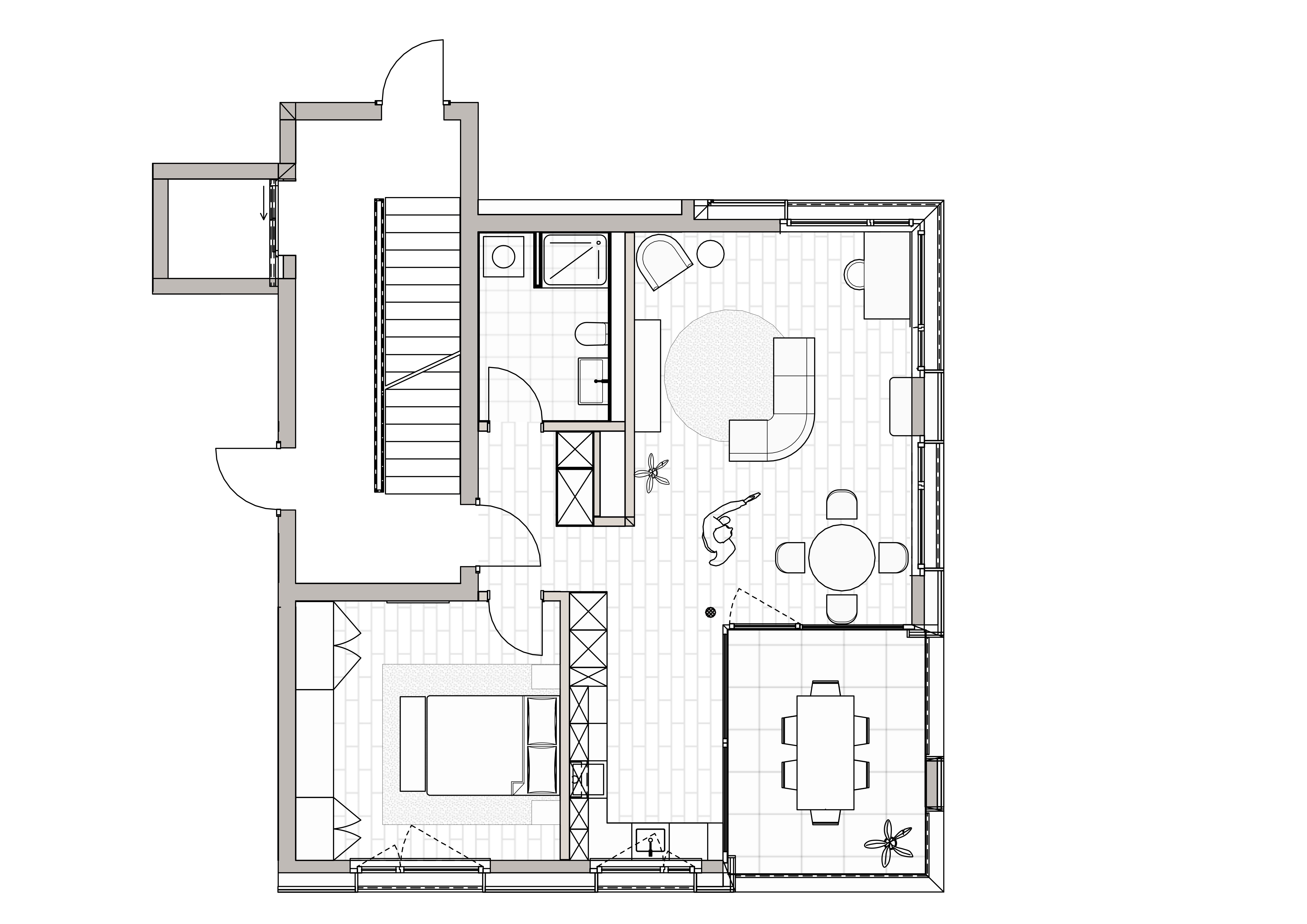 convert this floor plan into a realistic isometric 3d view of a full house show the space from an elevated angle with furniture walls and details visible the wooden floor is a light oak color the sofa is a creamy boucle texture the coffee table is a light beige wood the media unit in front of sofa is white the dining table is traverting with dining chairs in creamy boucle texture and wooden legs the sideboard behind the sofa is in travertine the office desk in the corner is in a darker walnut oak color with a modern office chair in beige in the bedroom the wardobe is white in the bathroom there are brown ceramic tiles the kitchen is white and the loggia i n the bottom right hand corner has concrete tiles use the same furniture as shows on the plan do not change the orientation of the floorplan