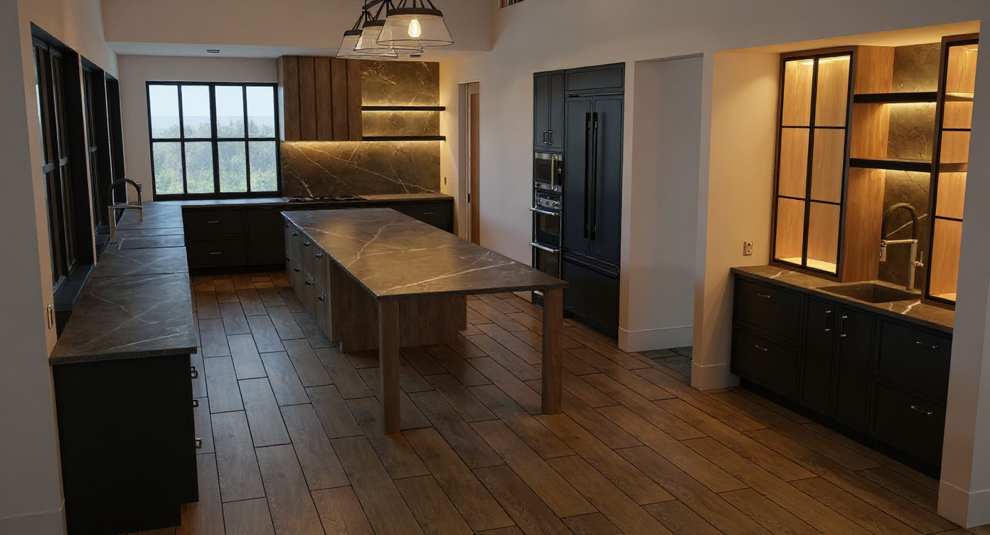 render this image photorealistic keeping all the elements create an ambiance with people light coming form inside the building create a beautiful winter sunny snow day