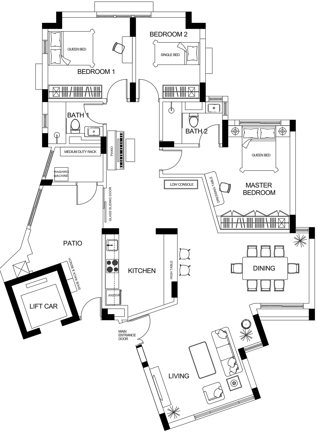 convert this floor plan into a modern isometric 3d view of a full house show the space from an elevated angle with furniture walls and details visible render a modern apartment layout with smooth elegant lines use a soft light neutral color palette with off white colour for the walls and oak vinyl tile for the flooring the living room to have a cozy cream sectional sofa and a plush beige rug add a sleek minimalist kitchen with glossy white cabinets and a marble countertop dark walnut dining table for the bedrooms use soft warm bedding and light curtains that allow natural light to pour in all windows are half height sliding windows half height windows at the patio without curtains with a washing machine as indicated bathroom to be simple in warm white wall tiles and light grey floor tiles all doors to be in oak wood laminate finish piano set to be in black glossy finish console to have a display piece set a serene and airy atmosphere with subtle ambient lighting use the same furniture as shows on the plan do not change the orientation of the floorplan