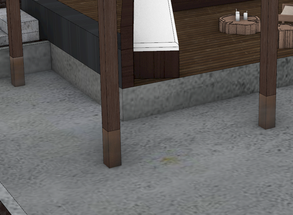 wooden columns decending into a awater pond but the bae of these columns are clad in copper sheet that ascends above the water level by 15cm the walls of the pond which are shown in grey is to be clad in black andesite hd realistic image