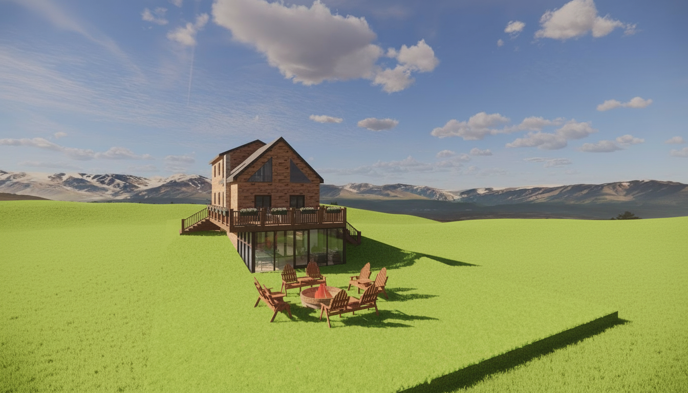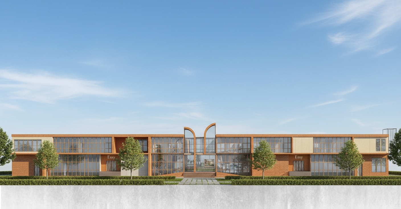 exterior shot render a modernist architectural building with sleek angular lines use a palette of light gray for the concrete deep charcoal for the window frames and reflective glass the building should stand in an urban landscape with a clear blue sky and warm sunlight to create a bright and inviting atmosphere add subtle shadows for depth and dimension highlighting the building s geometric design on the black metalic pots on each balcony some green plants hanging brown color transfor to pergolas