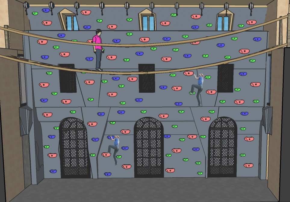 interior shot realistic rendering of an indoor climbing space keep all geometry layout and objects exactly as in the sketchup model do not move delete or add anything the climbing wall must have realistic climbing wall material with visible texture and grips the floor must be covered with dark gray shock absorbing mats a monkey bridge is placed in the middle of the space and a person may be walking on it naturally people may also be climbing the wall naturally include windows with natural daylight streaming in casting soft shadows and illuminating the climbing wall mats and monkey bridge realistically use realistic materials rubber grips textured wall surface foam mats wood or metal for the monkey bridge as in the model no artistic or stylized effects keep it clean detailed and photo realistic