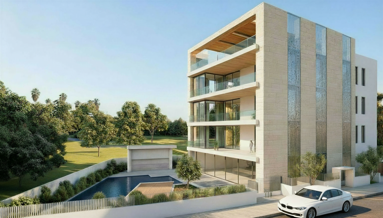 the villa is surrounded by a lot of trees bushes and flowers in the garden locate a modern firepit with seating couches on the paved areas by the pool