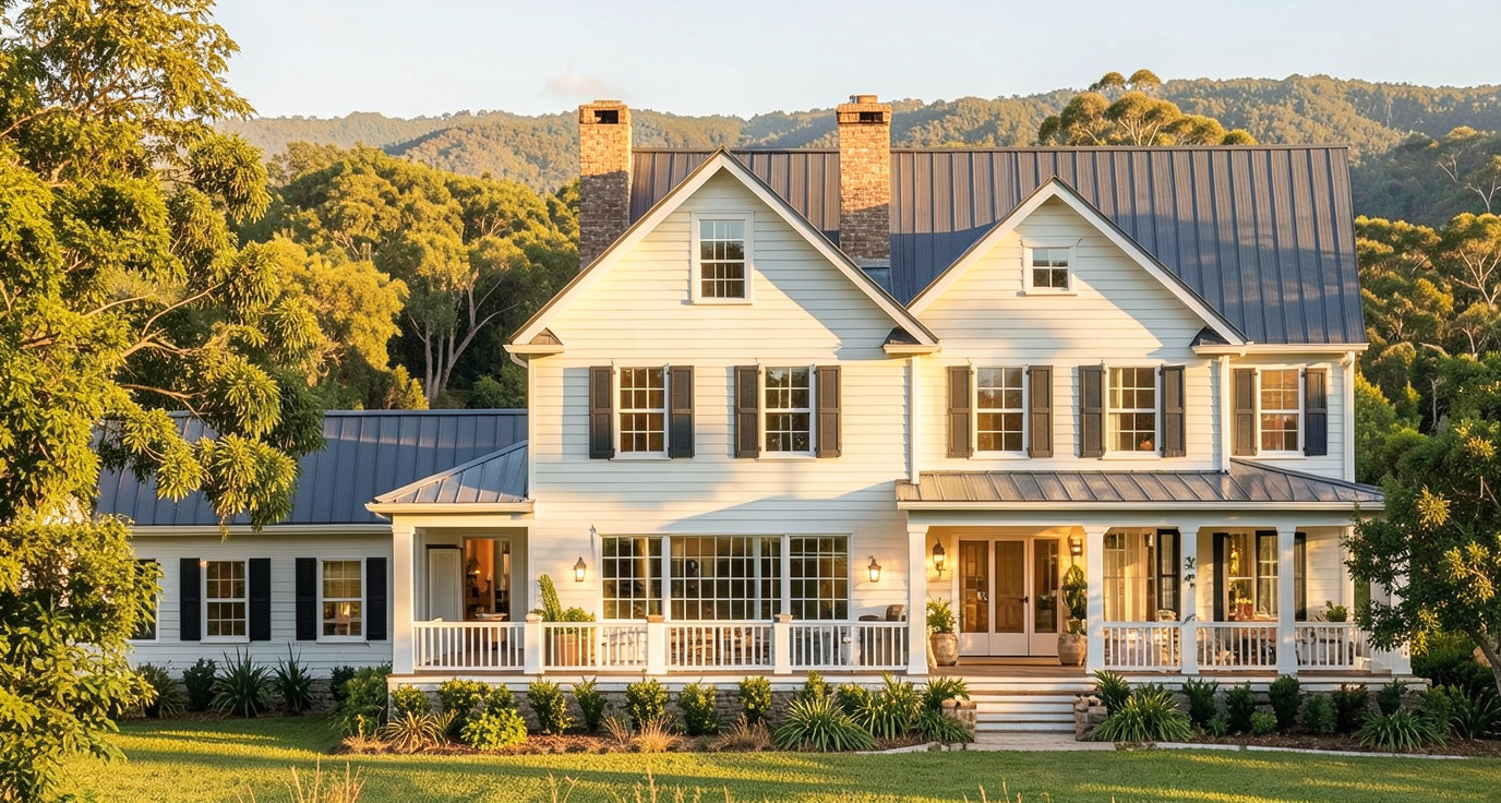 expansive southern estate with resort style backyard set on several acres of beautifully cleared and manicured land this stunning southern inspired estate blends timeless elegance with modern luxury the home s crisp white exterior accented by a sleek standing seam charcoal gray metal roof and striking black framed windows creates a sophisticated yet welcoming architectural statement the backyard is designed as a private resort retreat a sprawling contemporary looking square in ground pool serves as the centerpiece complete with a shallow sun shelf featuring built in reclining loungers for ultimate relaxation at the opposite end an elevated spa gently overflows into the pool adding both visual drama and tranquil ambiance contemporary poolside chaise lounges surround the water creating the perfect setting for entertaining or unwinding in style a fully equipped outdoor kitchen elevates the space even further offering a built in grill generous prep areas and bar seating ideal for hosting gatherings beneath open skies the grounds are thoughtfully landscaped to reflect a refined southern tropical aesthetic a mix of palmetto pindo mexican fan european fan and windmill palms adds texture and movement while crepe myrtles enhance the approach to the home majestic live oaks water oaks and loblolly pines provide iconic southern character complemented by layered ground foliage and lush manicured greenery this extraordinary property offers the privacy of a grand estate with the comfort and sophistication of modern luxury living make it the same as the sketch