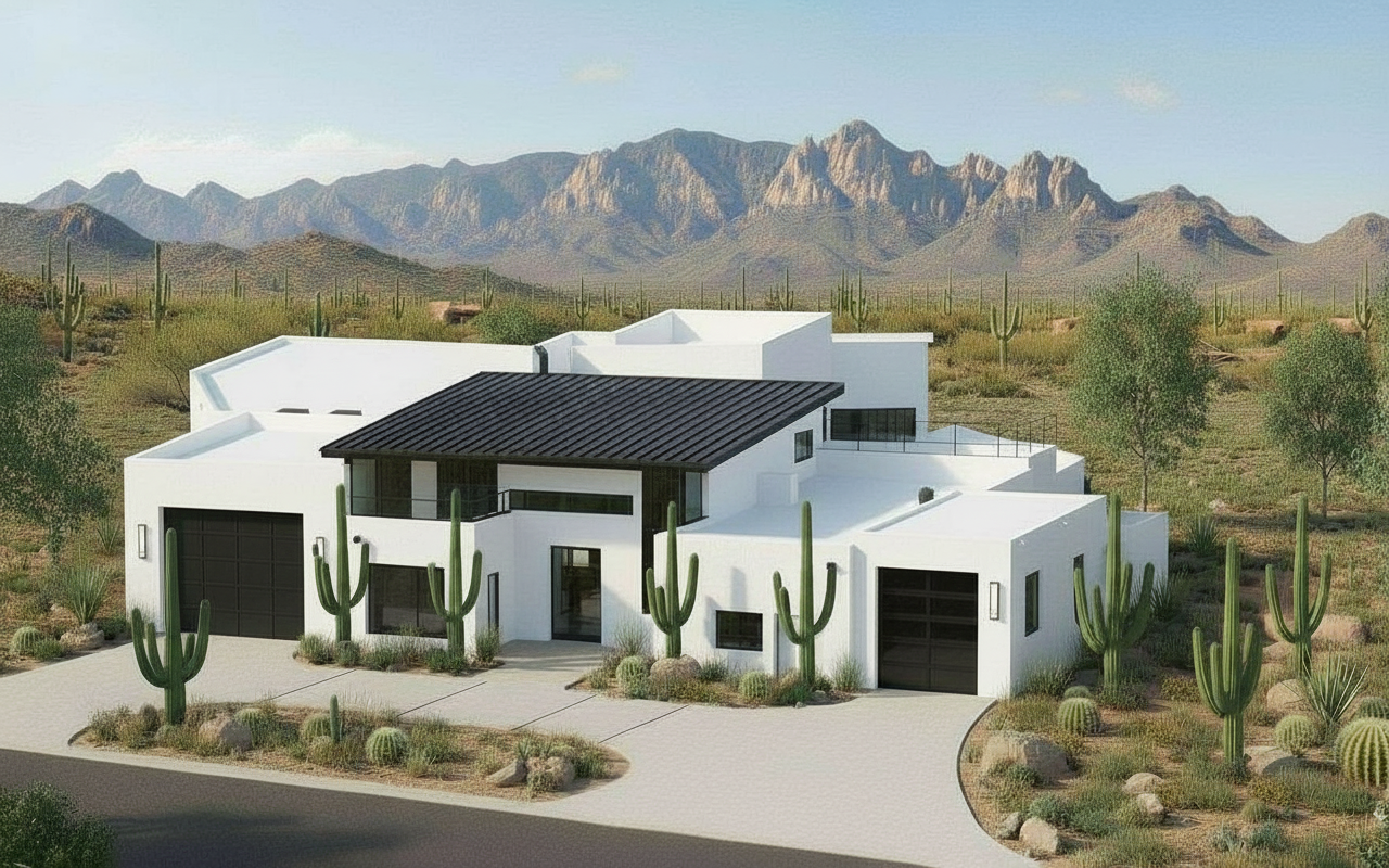 keep the structure landscape and background of the home the same please only change the exterior material of the very left mass which is the larger garger from white stucco to the stone ledge referenced image that s attached