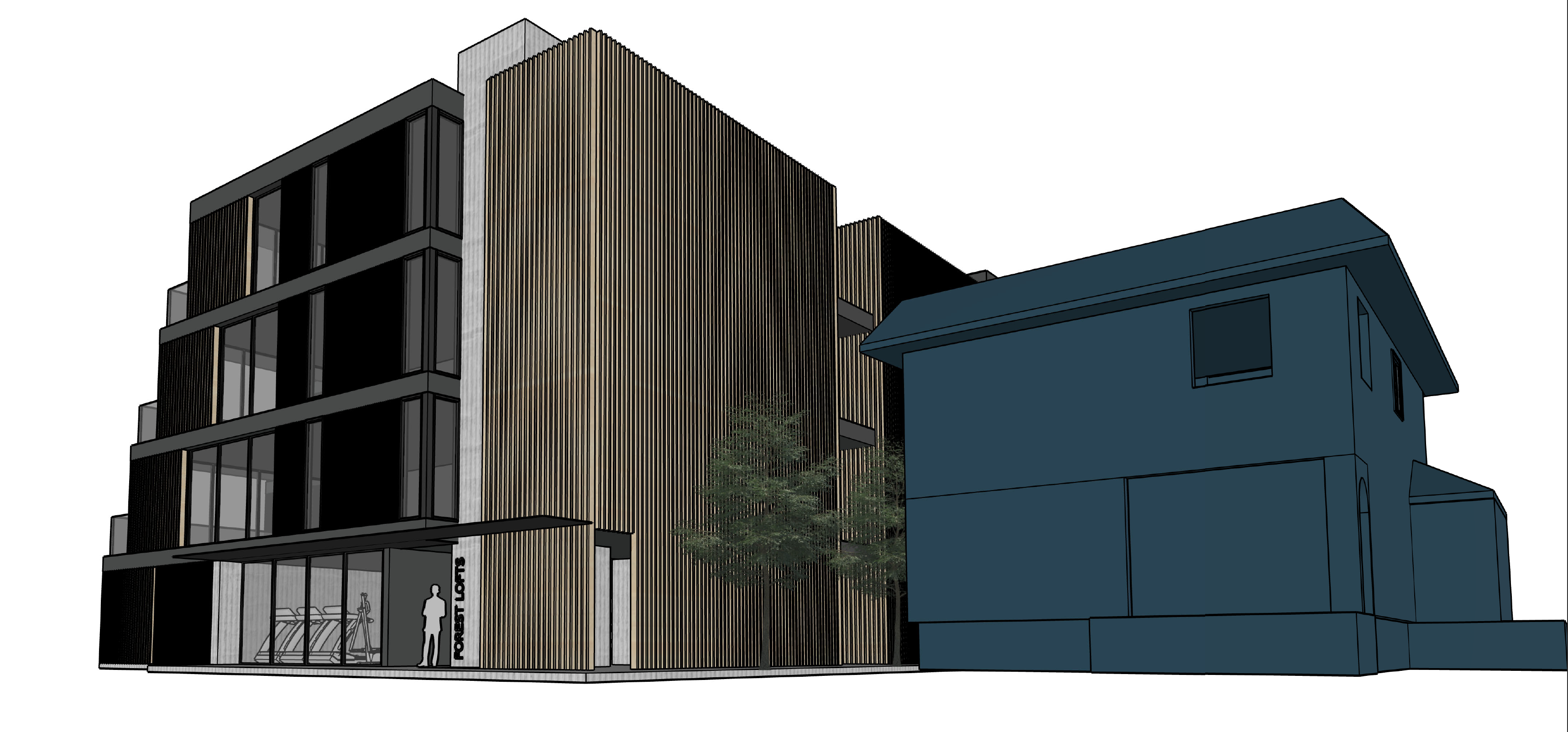 apartment building adjacent to the forest retain materiality and provide setting of pnw trees and early morning fog with dim lights