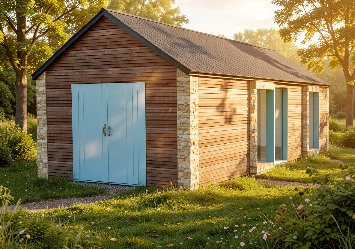 clean timber clad architectural exterior rendered in cinematic lush morning lighting wood garage doors asphalt driveway leading up to the garage doors warm horizontal cedar tongue groove wood siding with minimal grain pattern grass foreground black standing seam metal roof visible lush forest landscape in the background natural wood textures high fidelity photorealistic visualization crisp shadow falloff refined facade geometry richly detailed grain patterns soft atmospheric depth premium architectural photography mood ultra clean composition and materials