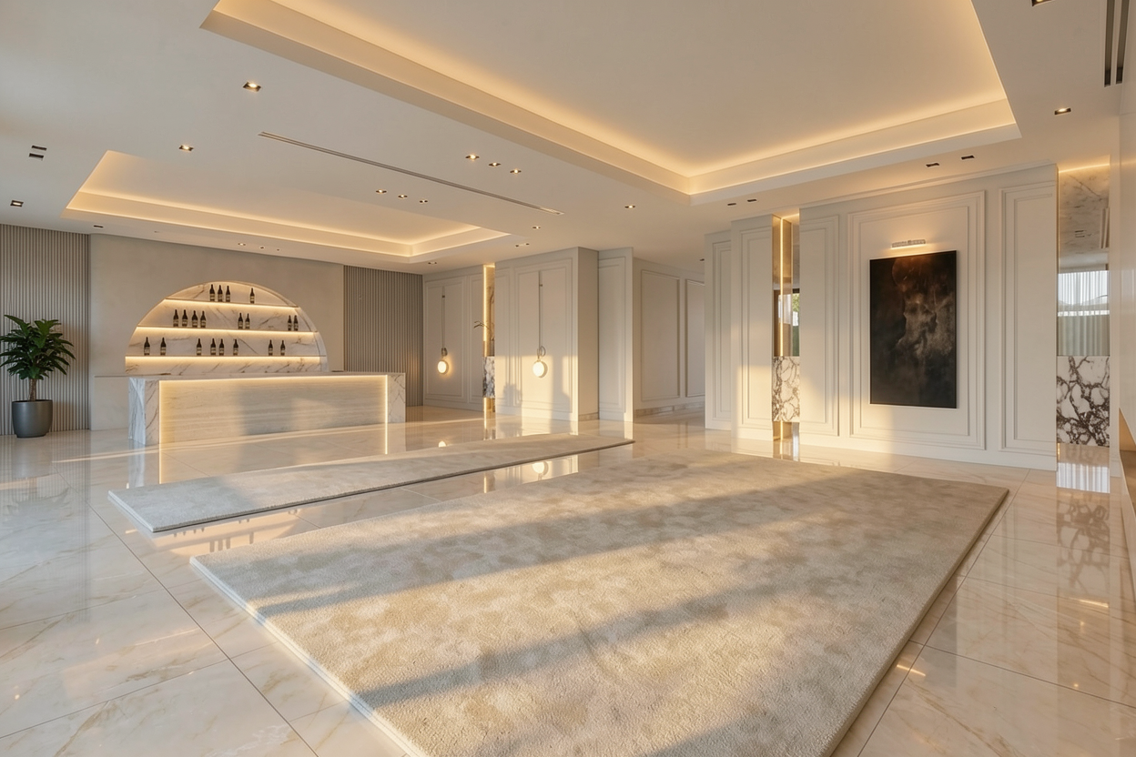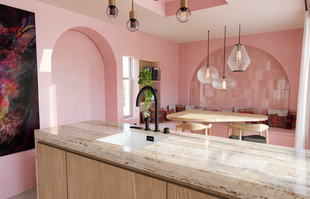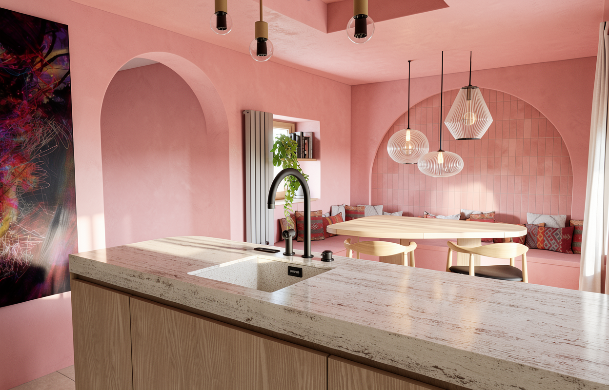 walls are dark pink ventian plaster tablet matt travertine not glossy window is a radiator where the books are is not a window it is a niche wood light oak pink cement tiles in the back