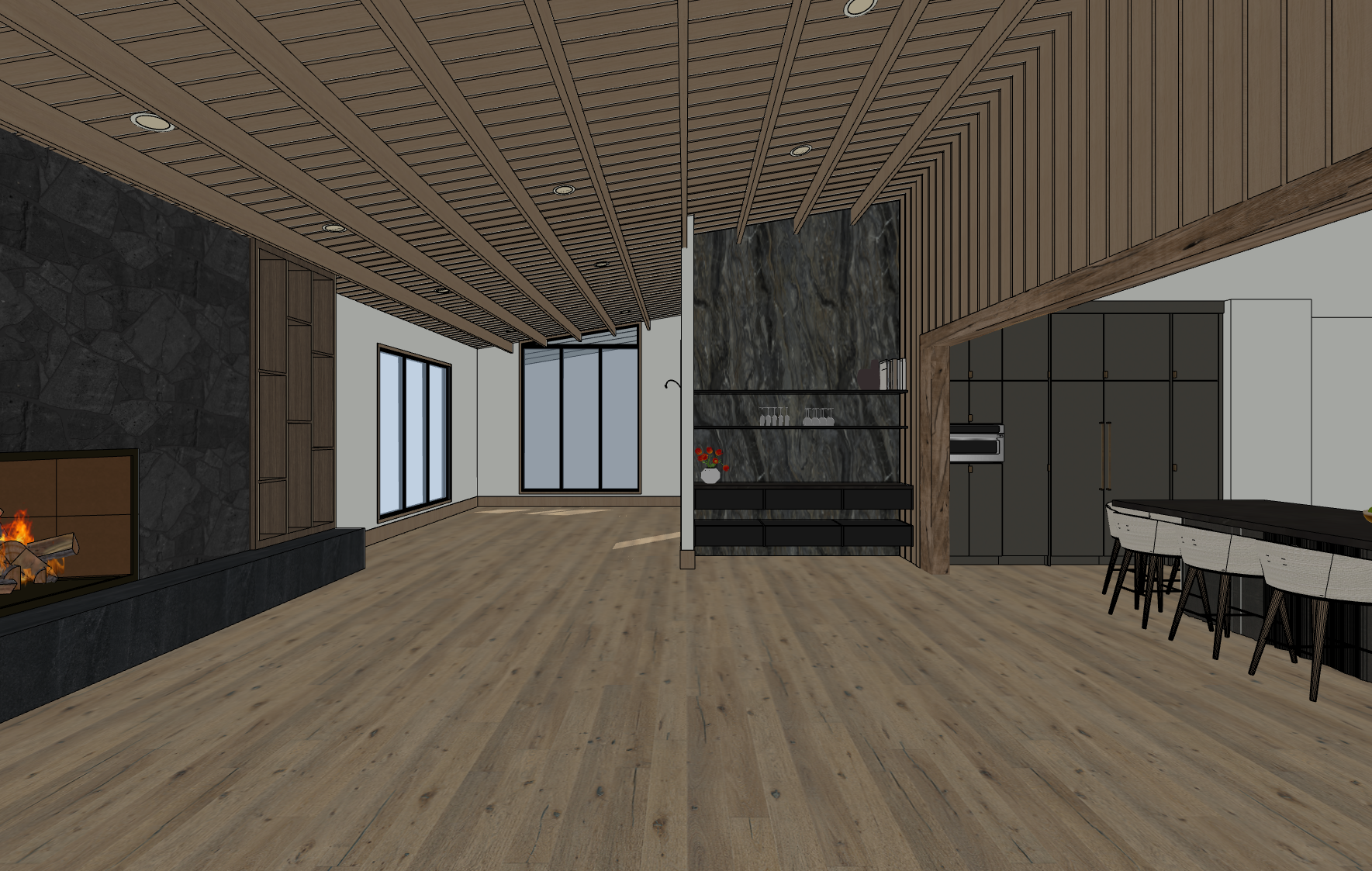 photorealistic enhancement of the provided architectural render preserve the exact architecture layout materials furniture placement and fixtures from the original image with no redesign or modifications the purpose is only to improve realism and lighting quality render as high end interior photography using a full frame camera with a 24 35mm architectural lens balanced exposure realistic dynamic range subtle depth of field and natural color grading the image should look like a professionally photographed luxury interior rather than a computer render soft natural daylight diffused window light global illumination balanced exposure do not change architecture do not change materials no redesign no new objects no additional lights no glowing fixtures no light from shower heads or faucets no dramatic shadows no surreal lighting no warped geometry no stylization the windows looking out to the exterior should be displaying mountains in the distance some trees the two floating shelves in the bar area should have led lights underneath them both