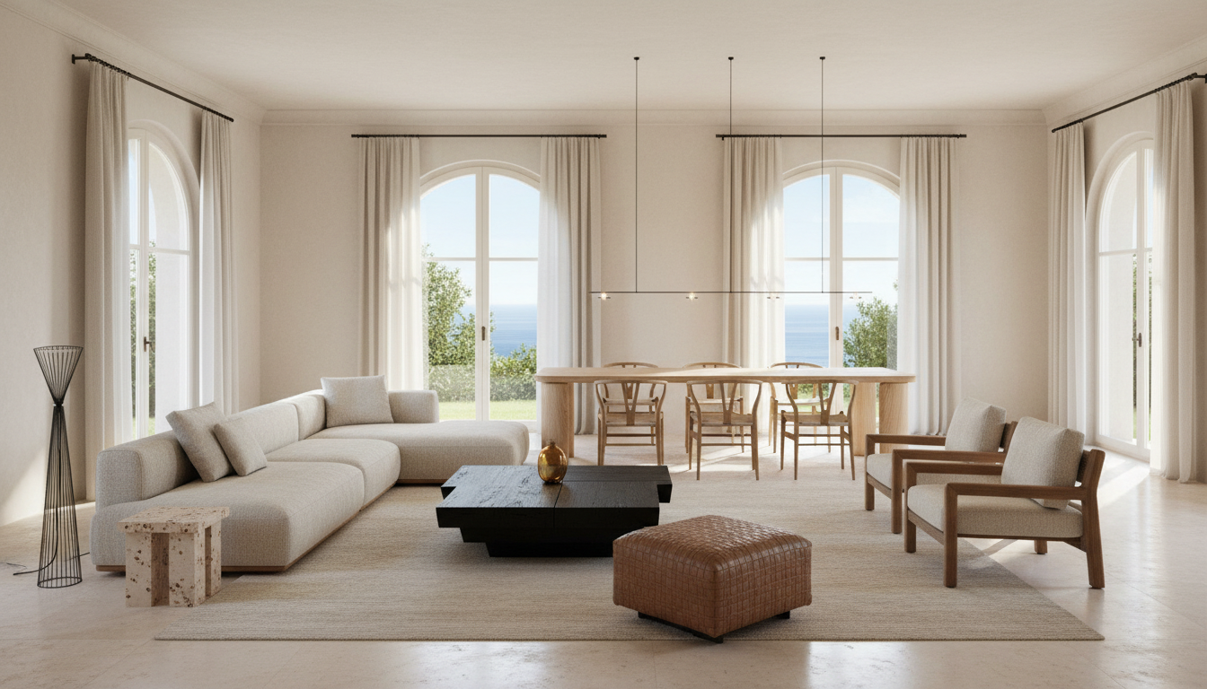 transform the provided wine cellar interior image into a high end photorealistic architectural render with warm atmospheric lighting and refined minimalist elegance while keeping everything strictly identical same proportions same arches same wall positions same ceiling curvature same niches same table placement and same overall spatial configuration do not move remove or alter any architectural elements geometry or furniture positions all walls and the ceiling must be seamlessly unified and finished in a soft beige lime plaster the surface should display a subtle mineral texture natural irregularities and a matte handcrafted appearance typical of traditional lime plaster interiors the ceiling should visually blend into the walls forming a continuous sculptural envelope the floor should remain in beige grey polished concrete waxed concrete with a smooth and refined surface slight tonal variations and soft realistic reflections typical of high end architectural interiors remove any stone wall appearance every vertical surface in the space must be treated consistently in lime plaster inside each architectural niche add warm concealed backlighting to create a soft halo glow within the arches the niches should contain elegant wine bottles arranged evenly and tastefully with realistic glass reflections dark green and brown tones and subtle label detailing integrate small recessed spotlights along the curvature of each arch both wall niches and main ceiling arches these spots should be discreet built into the plaster and emit a warm focused light grazing the curved surfaces to enhance depth rhythm and architectural geometry the central table must remain exactly in the same position and proportions appearing as a natural brown grey stone slab with refined mineral texture and subtle surface variations surrounding chairs must keep their exact original shape and placement but appear in natural wood with visible grain matte finish and warm tones lighting should feel architectural and atmospheric combining indirect lighting integrated led accents and the new recessed spotlights create a balance of soft ambient light gentle shadows and subtle highlights across plaster surfaces furniture and objects enhance material realism through detailed lime plaster texture realistic wood grain glass reflections on bottles and soft reflections on the polished concrete floor the final image should resemble a luxury architectural visualization of a contemporary wine cellar with cinematic lighting balanced contrast soft global illumination and ultra photorealistic material rendering while preserving the original design exactly