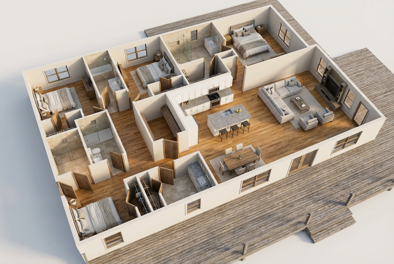 provide ambient light as if the space is viewed in the daytime add three people upstairs on the mezzanine put a centerpiece on the dining table have the light fixtures on subtle uplighting on each truss