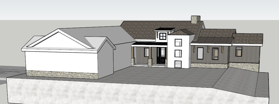 winter season paved or gravel driveway black asphalt shingle roof 2 garage doors on left side stone on tall 3 window section