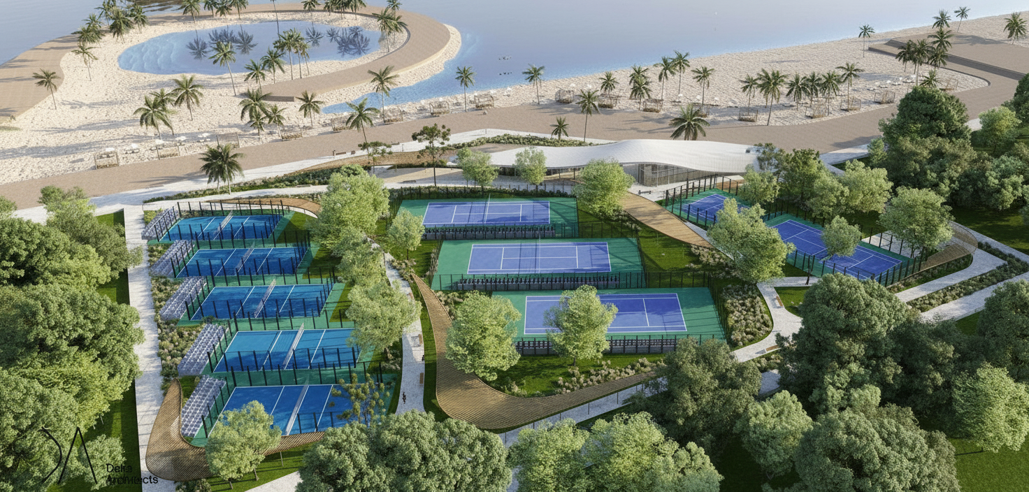 in the above image we have three areas the left and the middle ones have courts the tennis courts located in the middle area of the photo should be switched and placed in the left area where the padel courts are now and the padel courts should go to where the tennis courts are now that is in the middle area with the same diagonal arrangement