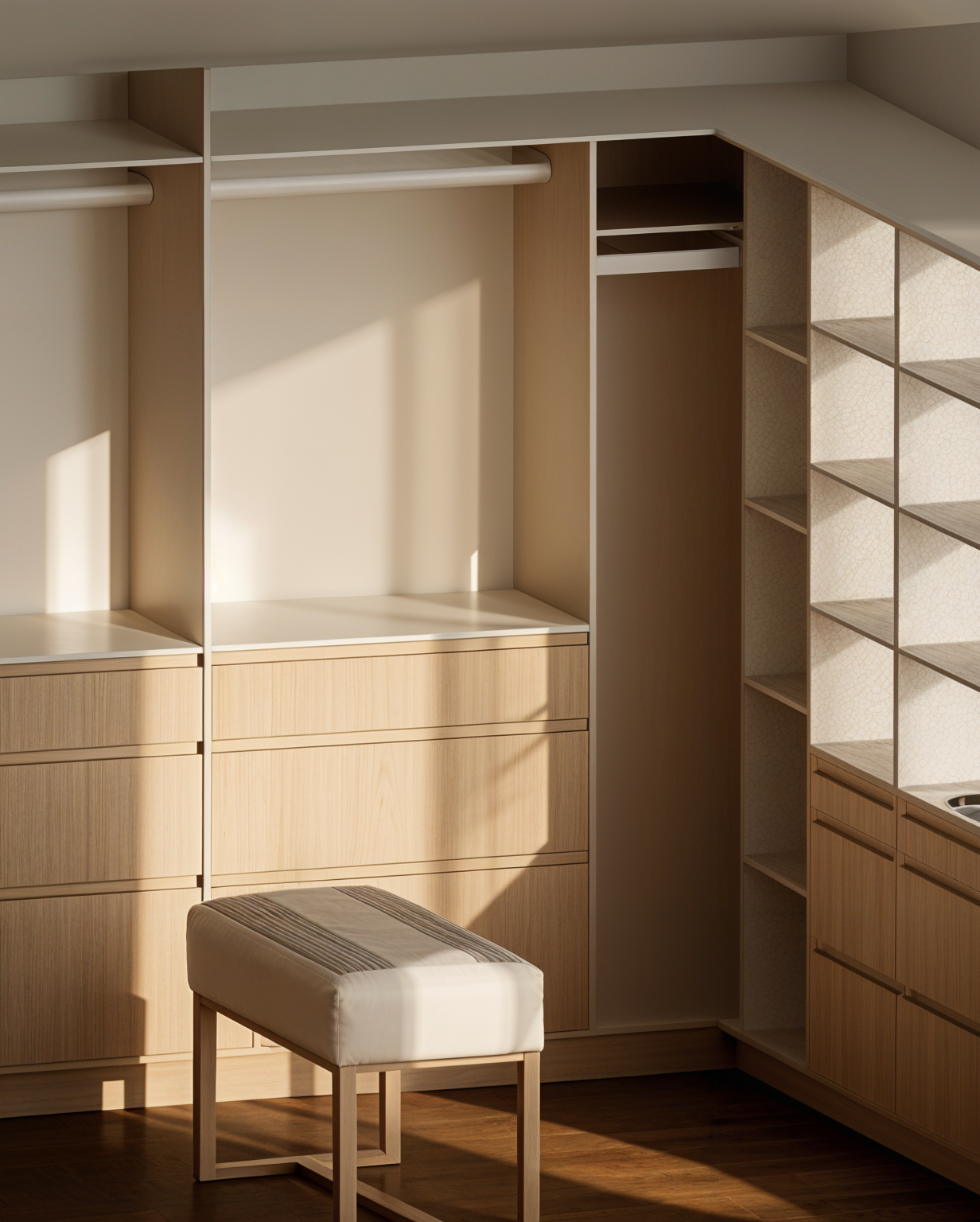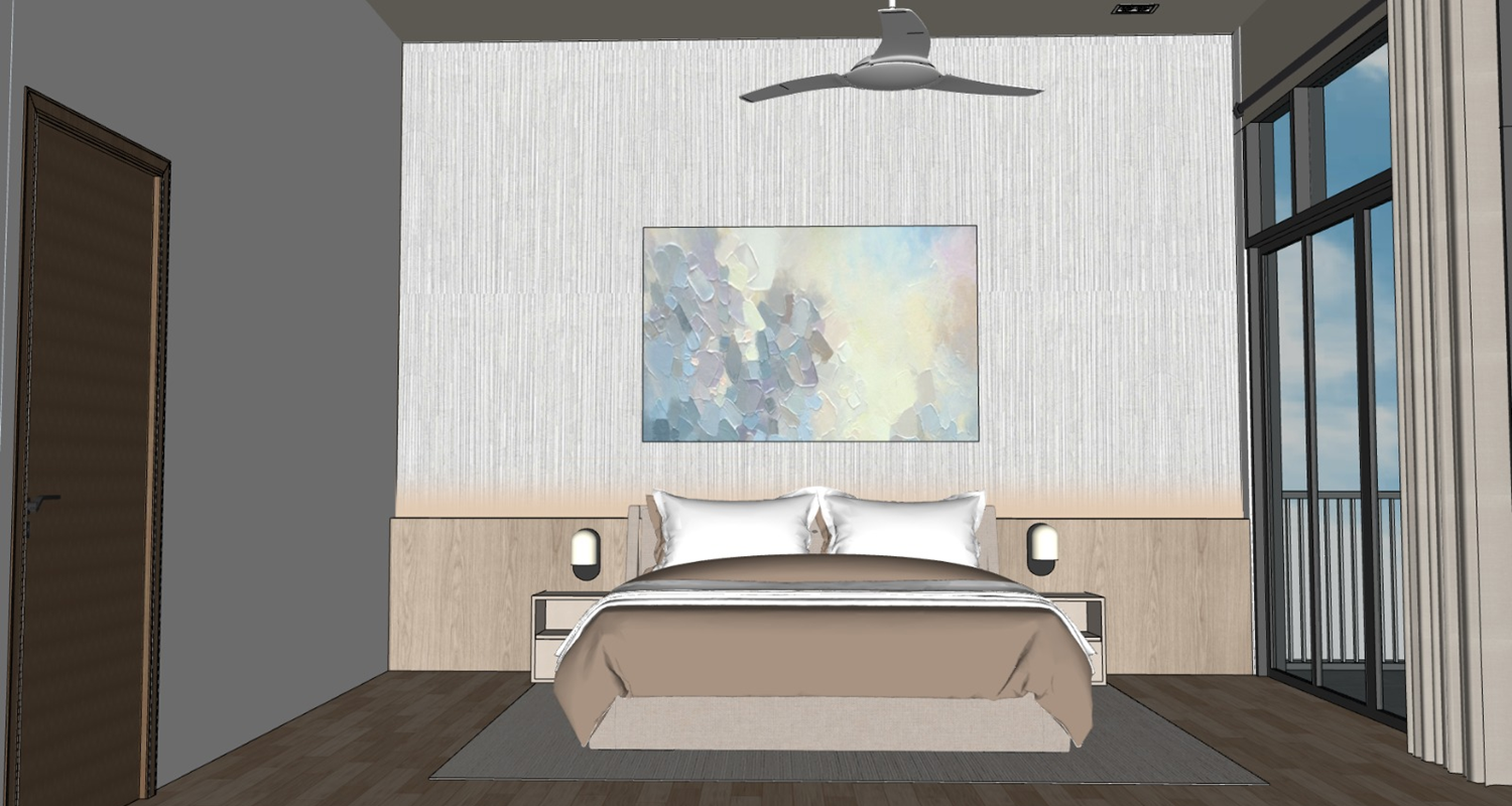 use the same material same colour same mood and make it realistic and detailed floor is vinyl wood add led add the frame the wallpaper at the back is slightly grey not woody make it more grey