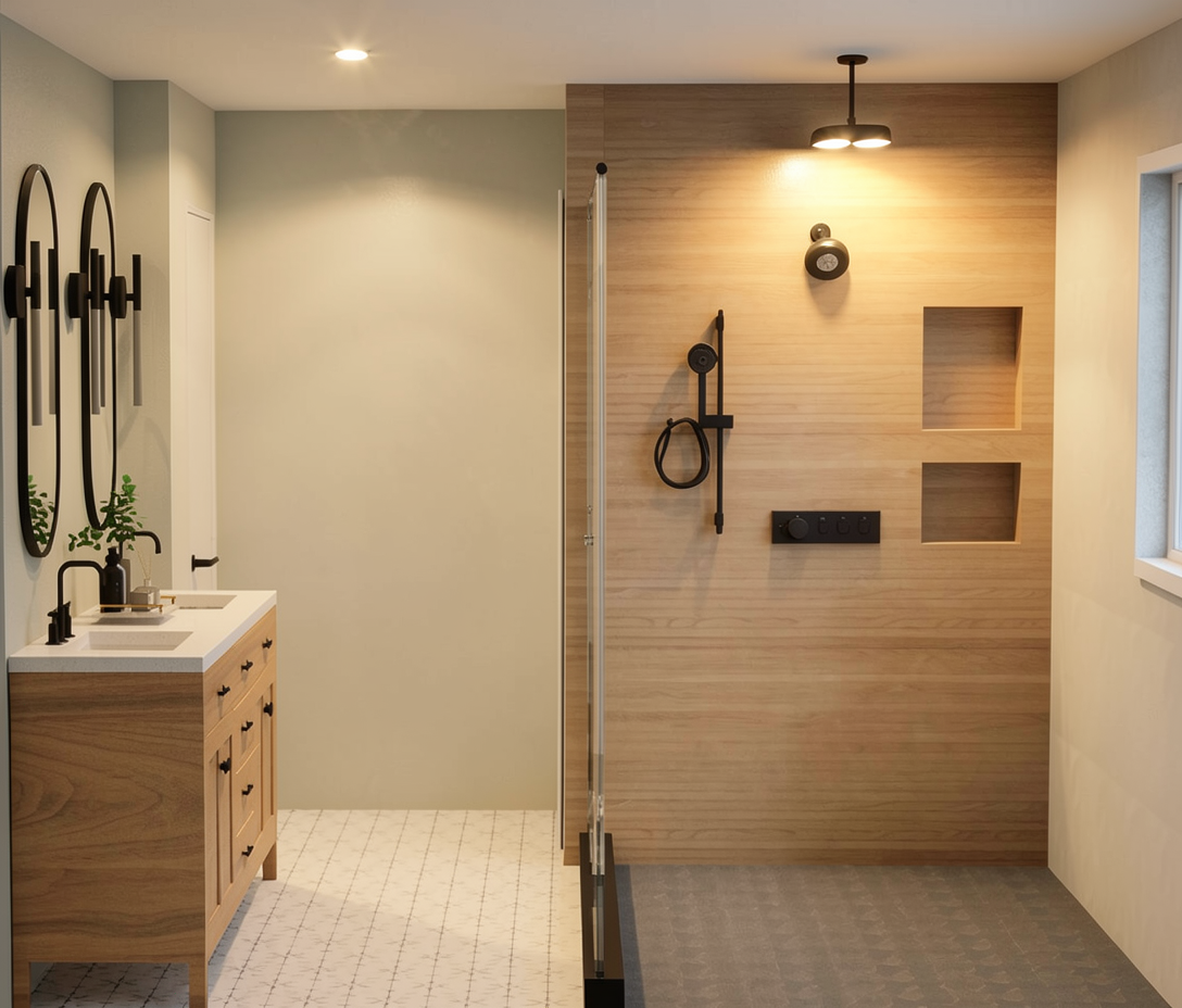 render this kitchen with tafisa cashmere finish brass hardware and fixtures stainless steel appliances quartz countertop and backsplash with very light grey vein floor to be light oak walls to be benjamin moore weathered white and base molding to be glossy white