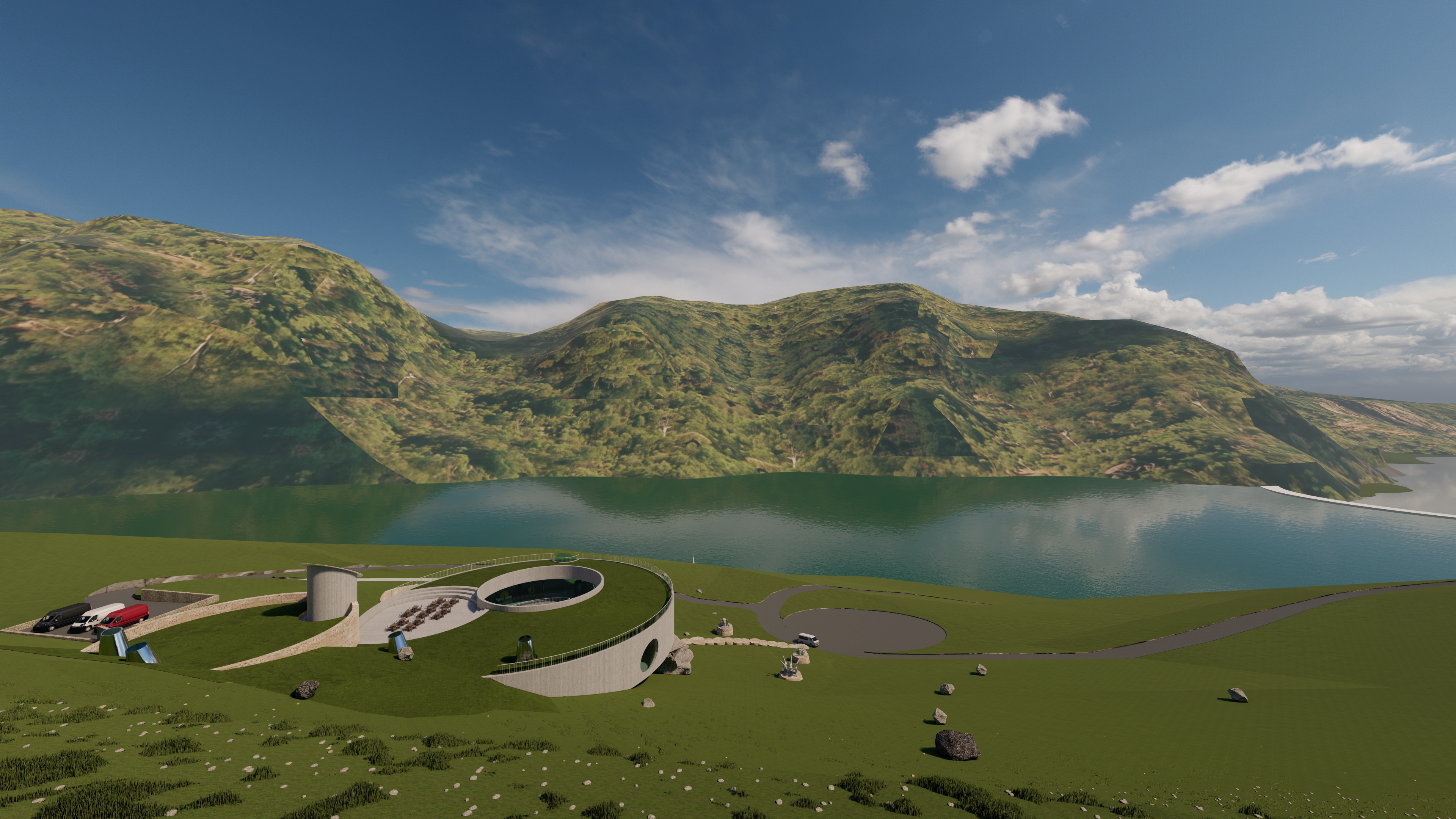 tadao ando exterior shot system role high end architectural visualization engine v ray corona master input mode image to image geometric fidelity is absolute and sacred 1 architecture geometry critical do not alter subject a monumental curvilinear concrete building structure the building is partially integrated into the steep hillside and partially cantilevered em balan o supported precisely by one large polished spherical element and a natural boulder as seen in the input image do not invent ou alterar a forma dos apoios roof the top surface is an extensive green roof low maintenance native grasses sedums 2 materials textures walls render as authentic aged raw concrete b ton brut with distinct formwork lines and realistic weathering spherical support mirror polished stainless steel with visible panel seams reflecting the environment road realistic asphalt pavement manter tra ado e limites originais 3 environment songo tete rainy season landscape the hills are characteristic of songo tete province mozambique steep rocky covered in dense vibrant green vegetation rainy season distant water the zambezi river reservoir calm deep blue water atmosphere golden hour late afternoon warm dramatic sunlight 4 entourage narrative vehicle the yellow toyota hiace van is the primary focus it is parked or driving slowly on the paved road rendered with accurate detail and realistic scale people place a small group of 3 4 students uniform dark blue white walking near the hiace or on the paved area sky flock of ibises flying high negative prompt new buildings generic structures dry climate plastic texture altering building shape inventing structural elements removing the cantilever distorted perspective model scale tilt shift effect toy like architecture