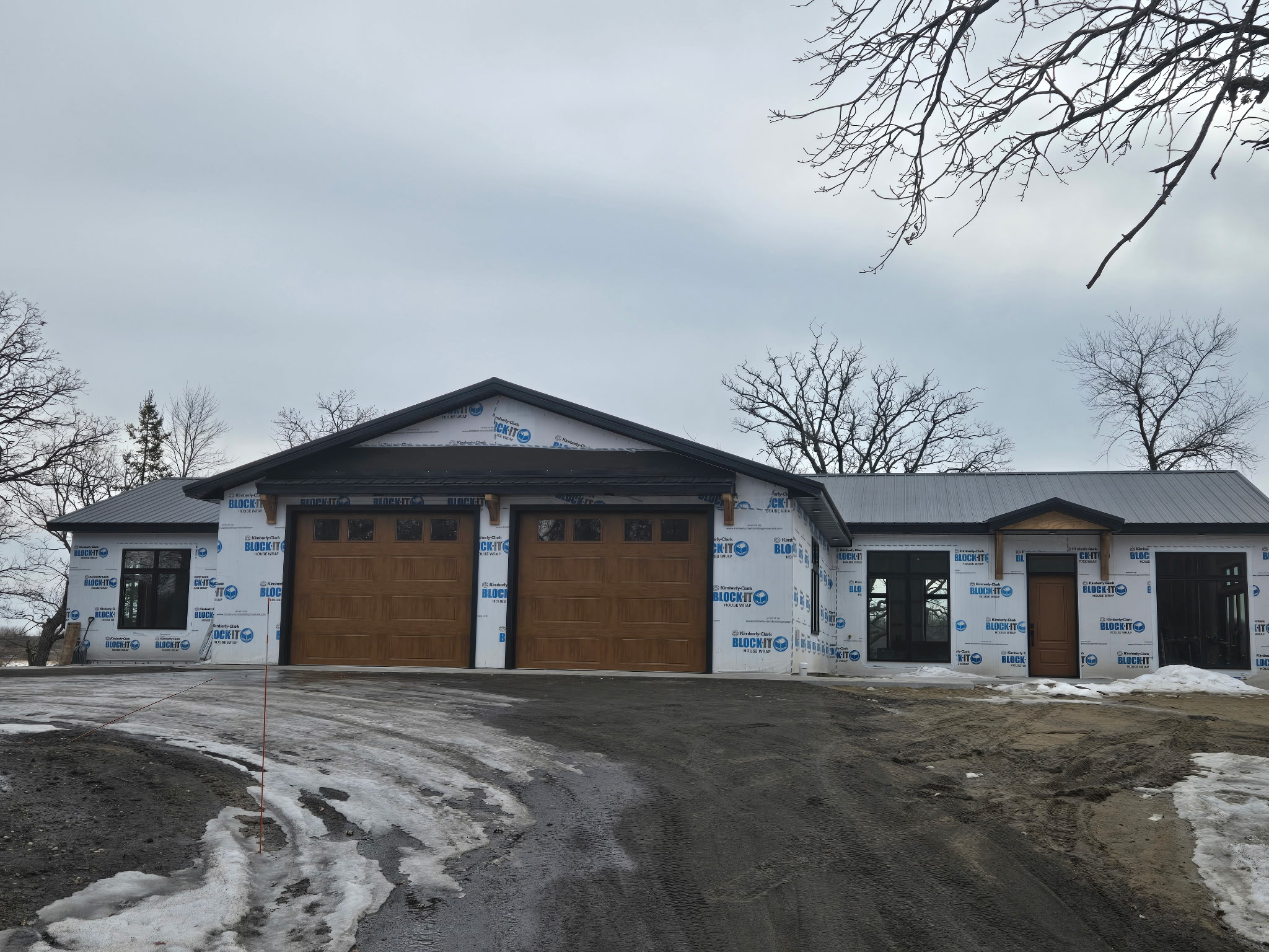 summertime lake in background nice landscaping royal blue board and batton siding dark grey gables black metal roof stone on bottom 3