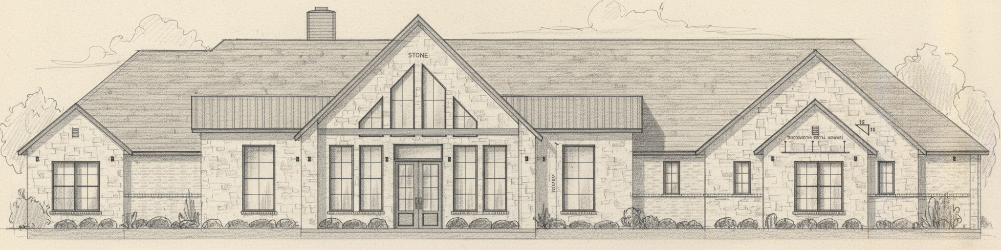 change to earth toned brick exterior with white limestone accents set the home in a wooded enviornment at sunrise black windows and a black roof