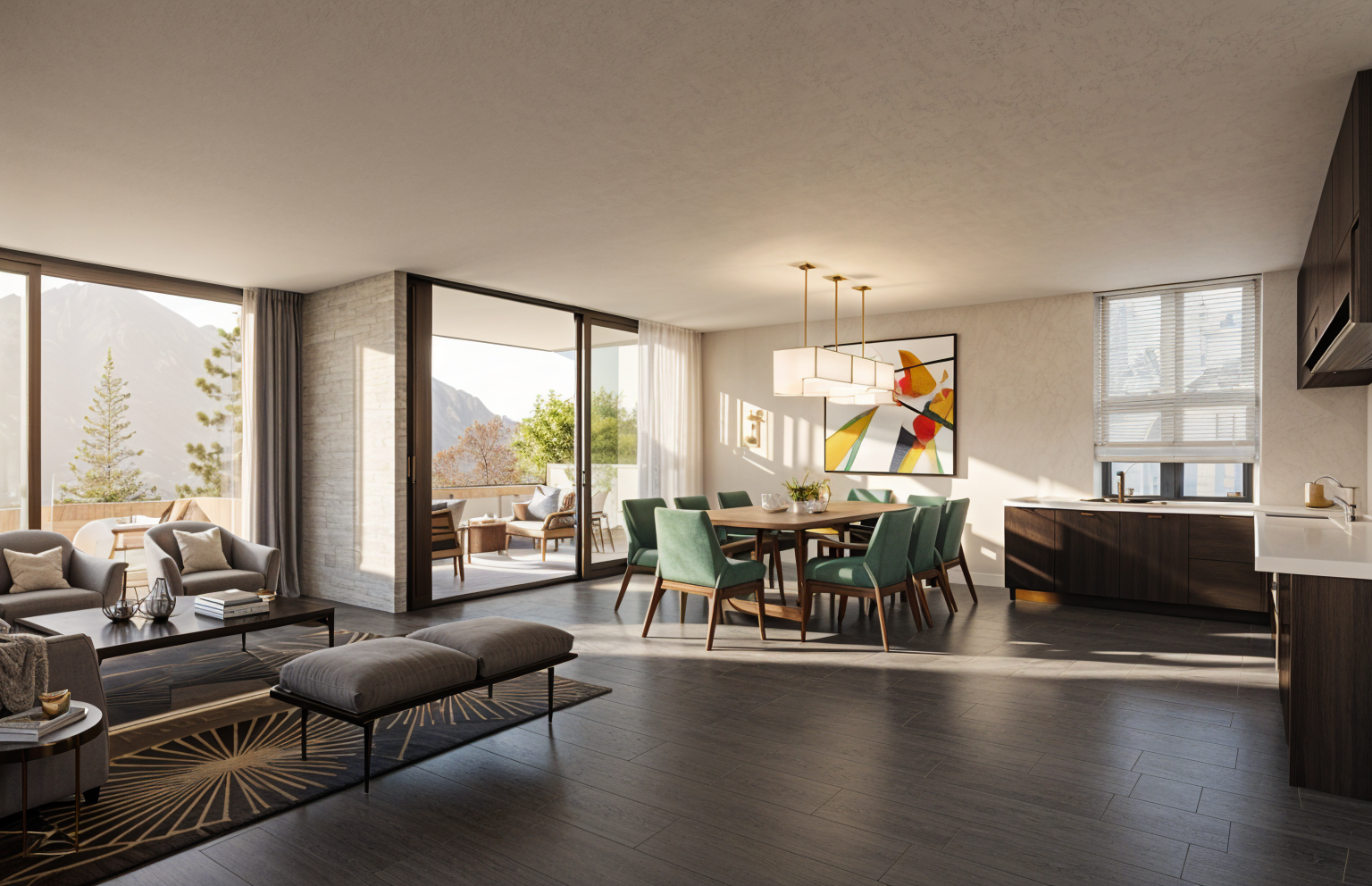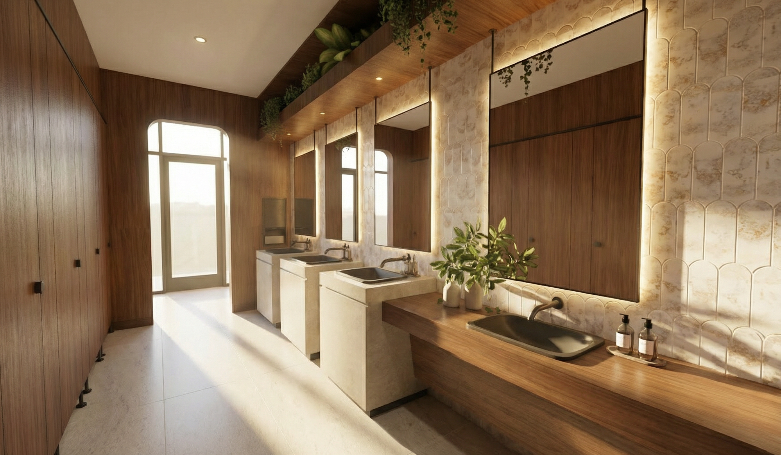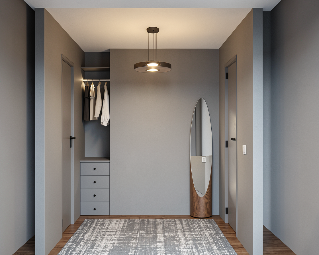 render my image walls are medium grey drawers ont he back left wall are same grey as the wall and built in light from the ceiling light add grey patterned rug to the floor add upholstered grey ottoman bench to back wall next to the mirror add abstract framed print to the back wall