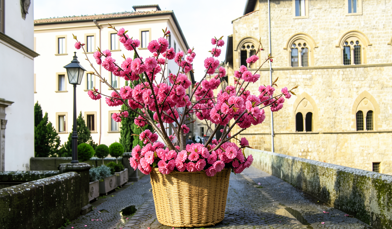 inserisci due filari di 6 alberi di prunus lungo le balaustre in muratura gli alberi sono in vaso ed hanno un rivestimento di canapa
