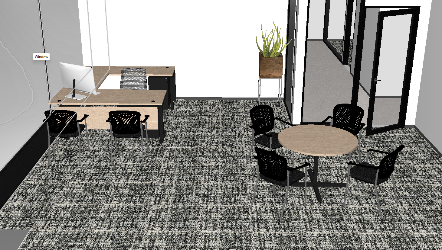 make realistic add decor add a floor plant add artwork on the walls the left window is the entire wall floor to ceiling make the artwork green and natural abstract