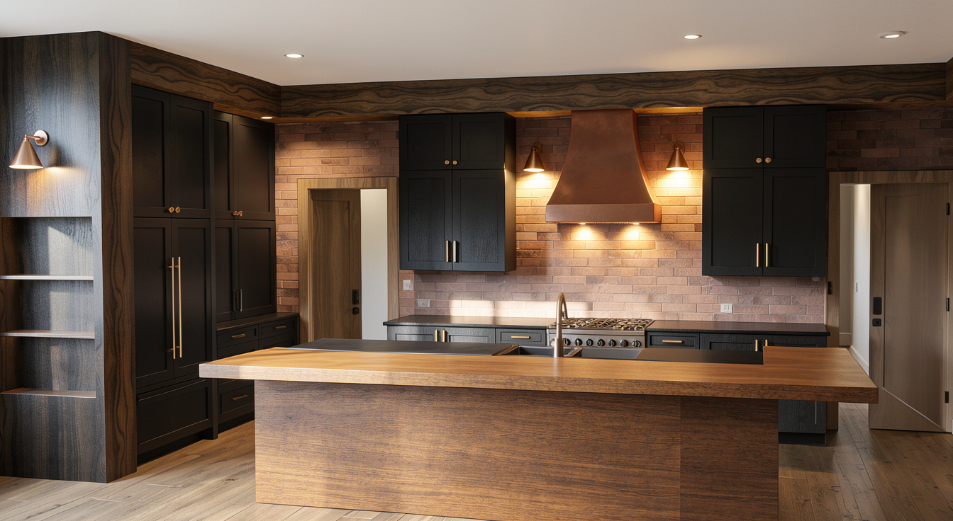 make the soffit beam the same shade as the island add realistic knots in the beam only a few and make it a medium caramel color this beam and soffit go down into the open shelving