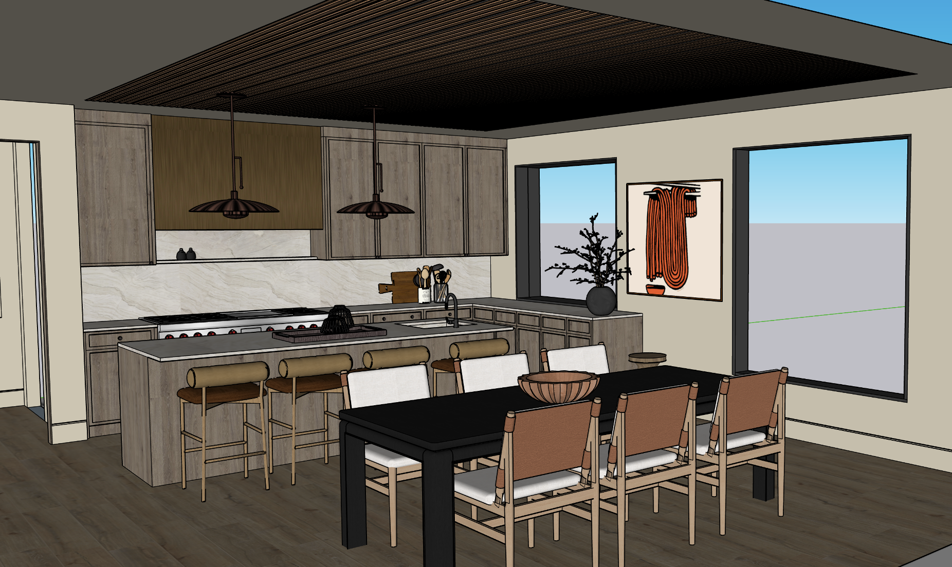 primary interior render prompt interior kitchen and dining space in a modern mountain home in park city utah overlooking jordanelle reservoir ceiling finished in ribbed wood planks in a warm truffle smoky white oak tone with subtle variation and matte finish kitchen cabinetry in warm truffle smoky white oak with 1 inch shaker doors and soft beveled edge profile large custom metal range hood in warm antique brass counters and backsplash in white pearl quartzite with soft veining and honed finish paint color benjamin moore oc 10 white sand on walls large black framed windows window near cabinetry is a functioning pass through server window to exterior deck daylight mountain light soft winter sun bright but cool exterior tones contrasting warm interior palette dining table matte black rectangular wood with woven natural chairs kitchen island with leather saddle stools and brass footrests subtle styling with ceramics and wood accessories neutral rugs architectural calm mood photorealistic cinematic lighting wide angle interior view magazine quality high end architectural visualization exterior view through windows prompt mountain reservoir landscape visible through windows jordanelle reservoir utah rolling hills blue sky winter light calm reflective water high elevation feel realistic depth of field crisp atmosphere deck and overhang prompt exterior deck visible through pass through window and glazing cedar plank decking with warm natural finish steel cable railing system with black posts and wood top rail wood soffit overhang above deck with recessed lighting contemporary mountain architecture clean lines upscale lake house aesthetic short version for fast testing modern mountain kitchen in park city utah overlooking jordanelle reservoir ribbed wood ceiling in warm truffle smoky white oak matching cabinetry with 1 inch beveled shaker doors antique brass metal hood white pearl quartzite counters benjamin moore oc 10 white sand walls black framed windows and server window to exterior deck cedar deck with cable rail and wood overhang outside photorealistic warm interior cinematic daylight
