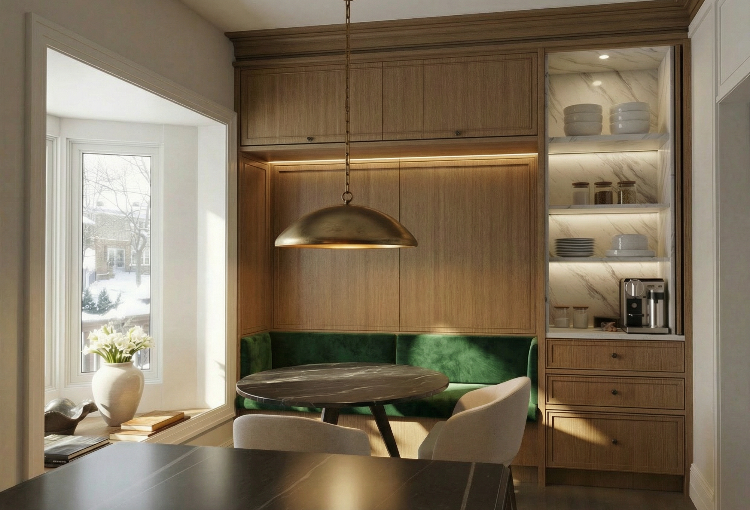 create a cozy and elegant interior hallway scene with a rich navy blue door featuring detailed glass panels surrounded by a soft white wall include sleek gray cabinets on the left with minimalistic black decor items and an off white bowl on the right depict sheer white curtains against light oak framing use dark oak hardwood flooring to enhance the warmth of the space ensure soft ambient lighting to maintain a welcoming and sophisticated atmosphere
