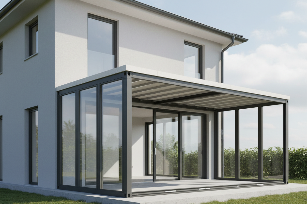 put frame infront of existing house with sliding door to make extentsion show the frame as is do not add anything to it make right portion