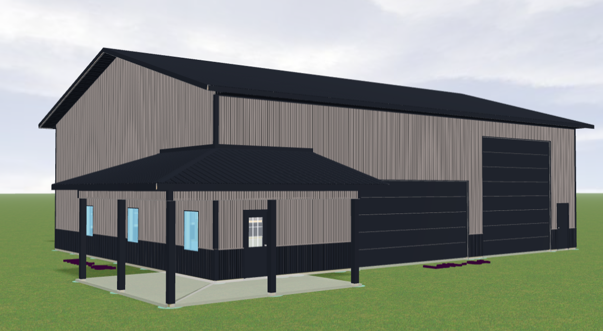 make this look real make the grids in the walk in door black and make the windows match put four 24 long x 12 tall windows in each of the overhead doors make it a sunny day with a concrete approach and concrete under the porch add some smaller trees native to iowa