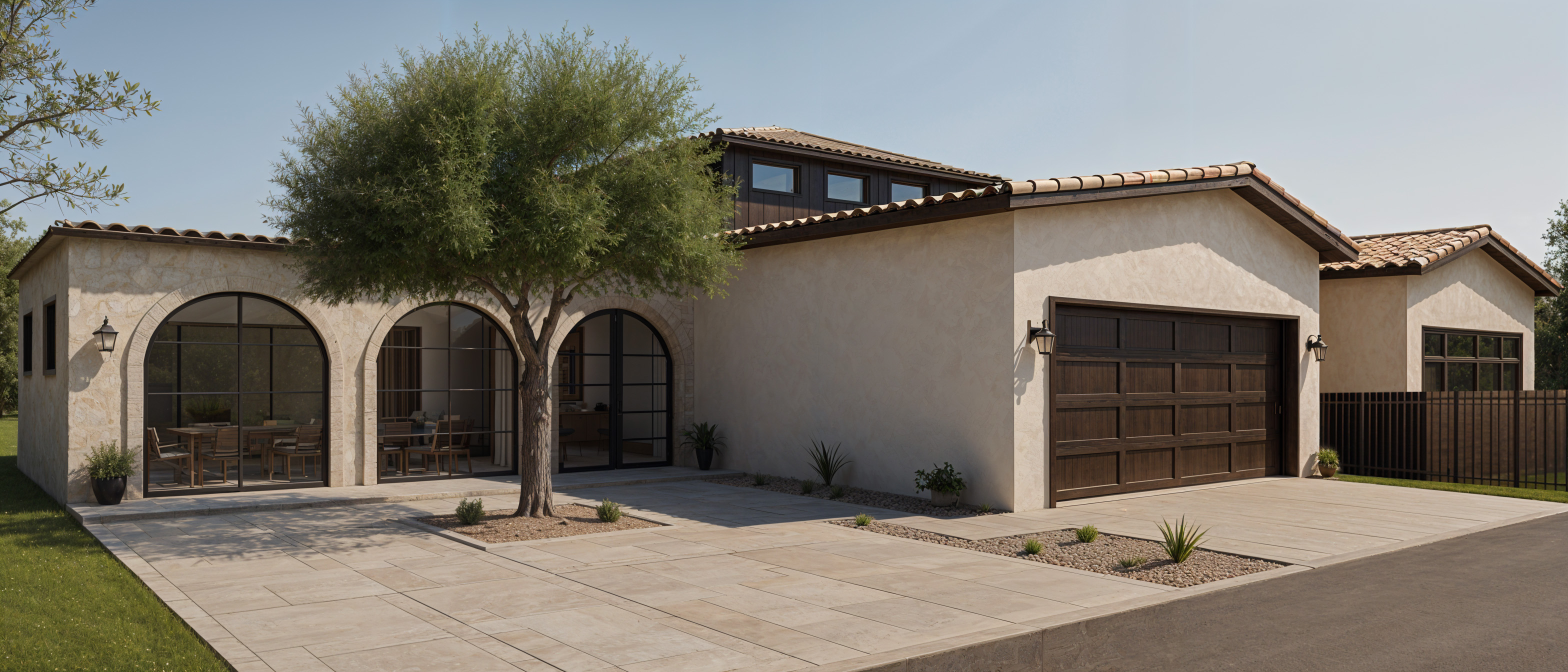make the roof tiles sage green color and the window color jet black make garage door black make the stucco white