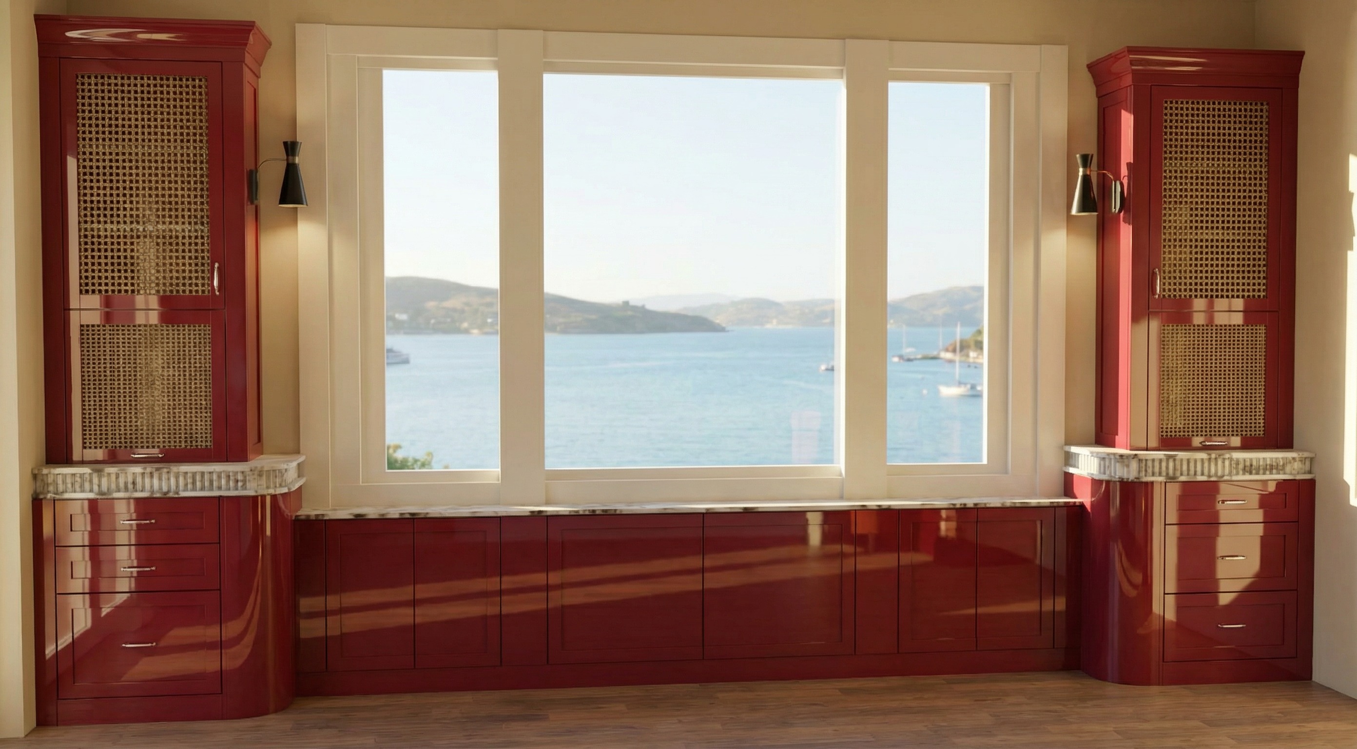 i only want 3 changes made 1 change the color to 20 sheen dark red 2 change the window so it looks out onto bayshore blvd in tampa fl 3 add vertical reeding onto the curved pilasters only