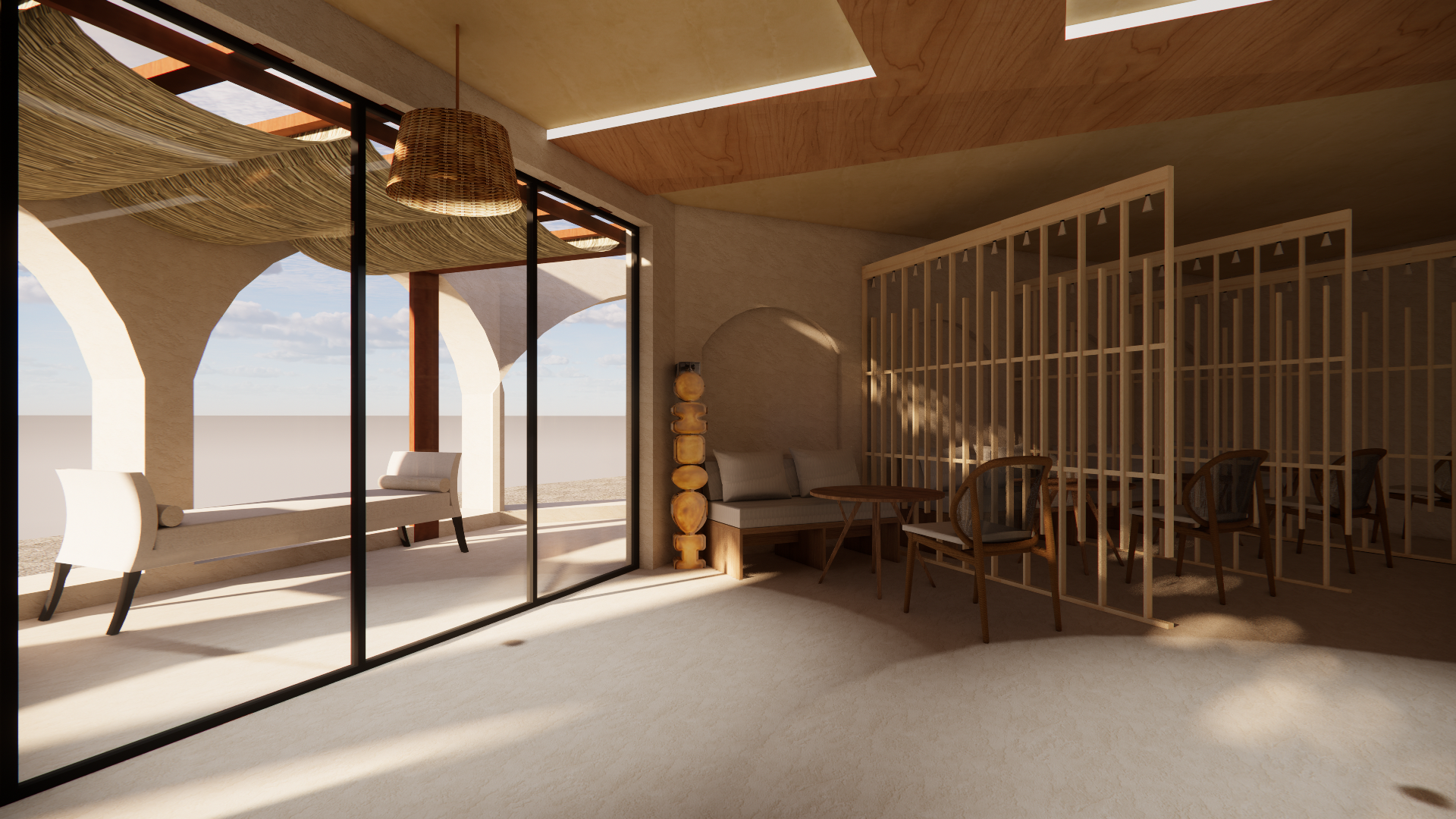 luxurious arabic modern interior inspired by the reference image asta studio warm beige stucco walls arched openings and soft ambient lighting create a moody elegant atmosphere from inside the lounge there is a clear view of the venice marina in djibouti with the sea visible through the arches the space blends arabic sophistication with somali design elements subtle geometric patterns handcrafted textures and natural materials include brass details wood finishes and lush greenery near the arches lighting is soft and ambient glowing from hidden wall lights and reflected surfaces giving the interior a warm intimate tone the composition feels refined cultural and modern rooted in horn of africa coastal identity while maintaining a dubai level sense of luxury