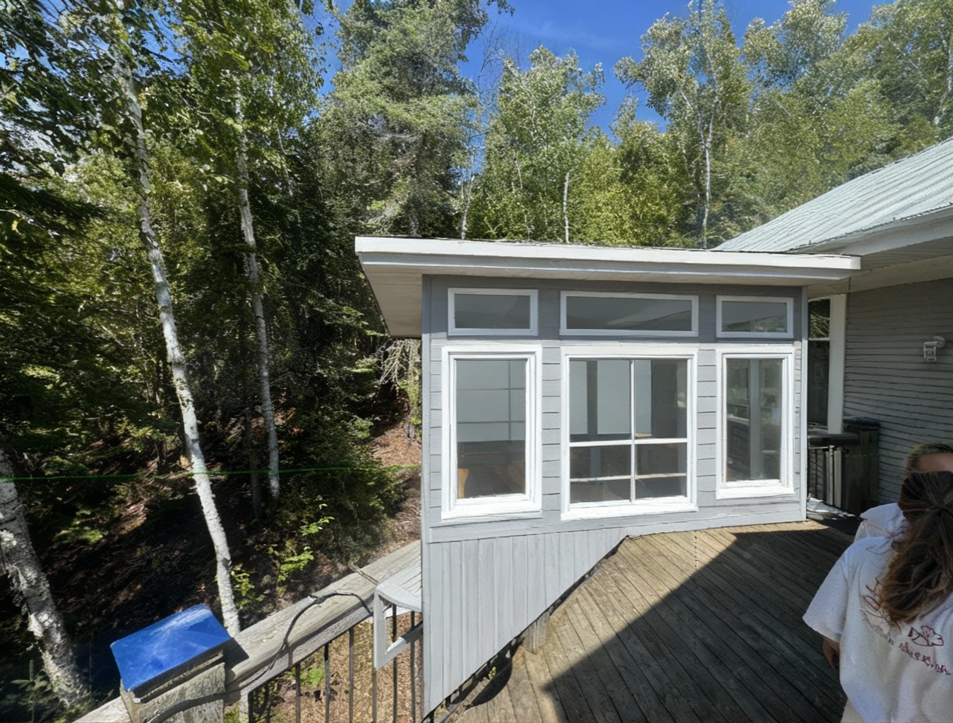 modern farmhouse two story house front elevation roof slate gray walls white with dark wood trim windows large with black frames deck wrap around door dark oak garage matching walls landscape xeroscape sky clear blue with soft morning sunlight overall atmosphere inviting cozy harmonious blend of modern architecture and nature