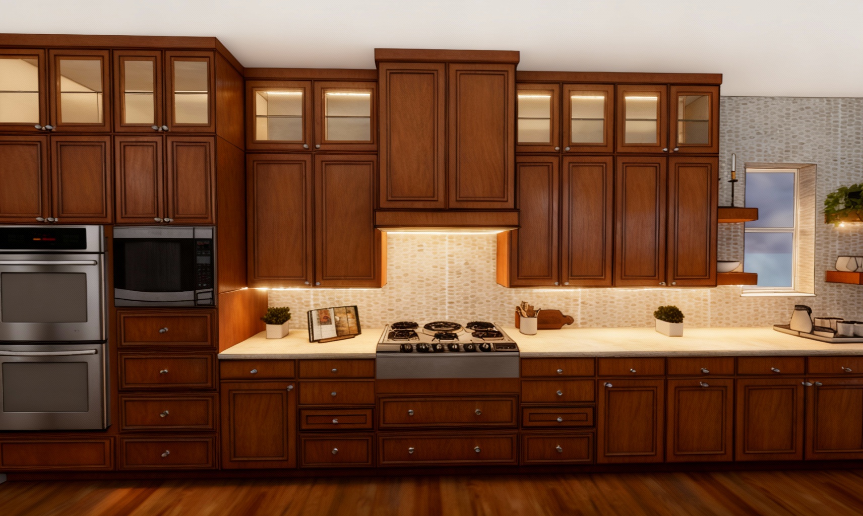warm wood cabinets with raised panels under cabinet lighting and lighting under all shelves create a warm and inviting kitchen