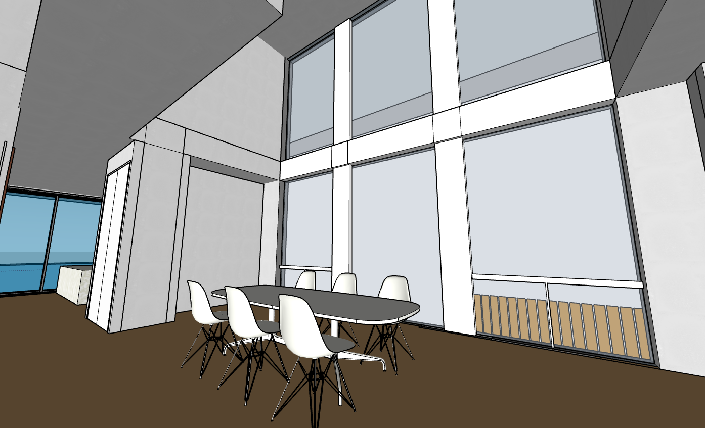 contemporary interior shot contemporary dining room with double height ceiling and large window wall with sunlight shining through architecture