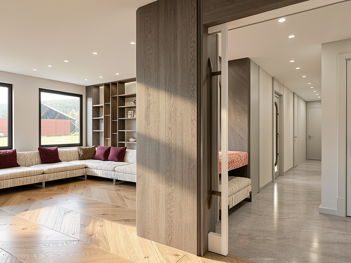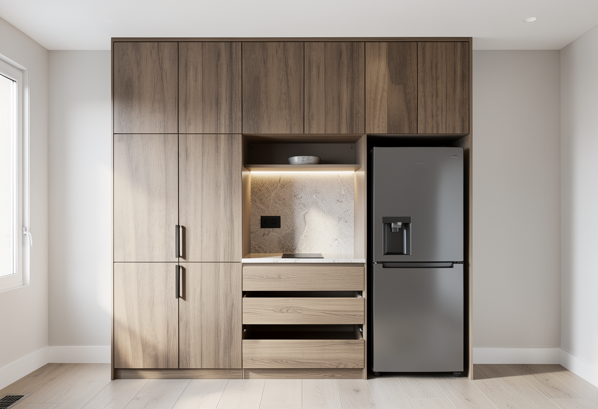 create a clean architectural kitchen elevation rendering based on the provided drawing maintain the exact cabinet layout proportions and alignment from the elevation do not change geometry cabinet sizes appliance locations or layout the image must remain a flat 2d orthographic elevation view important requirements keep the view perfectly front on no perspective no 3d angle maintain a technical elevation style cabinetry upper and lower cabinetry finished in soft warm white shaker style doors with subtle recessed panel detailing drawer fronts include slim brushed brass bar handles benchtop light grey marble look stone benchtop with subtle veining splashback gloss white subway tile splashback laid in a horizontal stacked pattern with light grout sink and tapware apron front farmhouse sink with brushed brass gooseneck tap appliances centered cooktop below the blank wall area built in wine fridge on the right side with glass door and timber shelving rendering style clean architectural elevation style flat orthographic view even studio lighting subtle material realism minimal shadows professional kitchen joinery drawing presentation render quality ultra clean linework high resolution architectural presentation quality soft material textures no perspective distortion important remove construction lines x marks in cabinet panels but retain all cabinetry and appliance placement exactly as shown keep the image strictly as a 2d elevation drawing with realistic materials applied