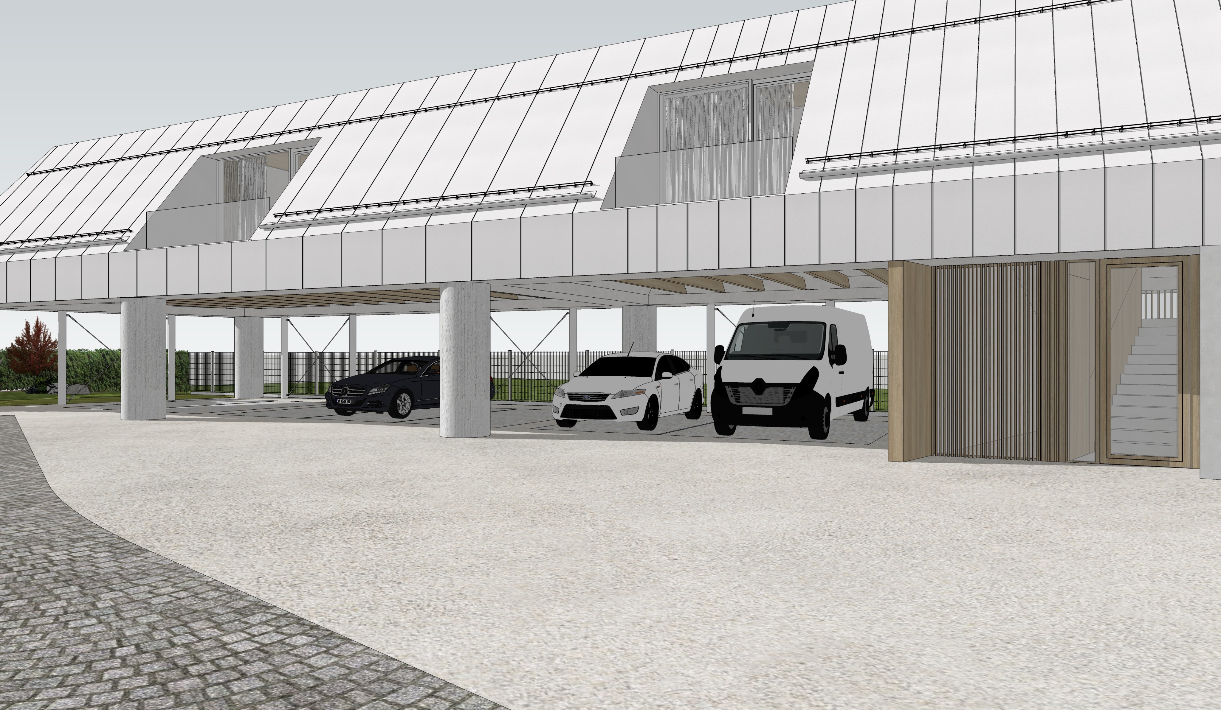 photorealistic visualization roof material gray sheet metal columns concrete greenery real grass winter clouds