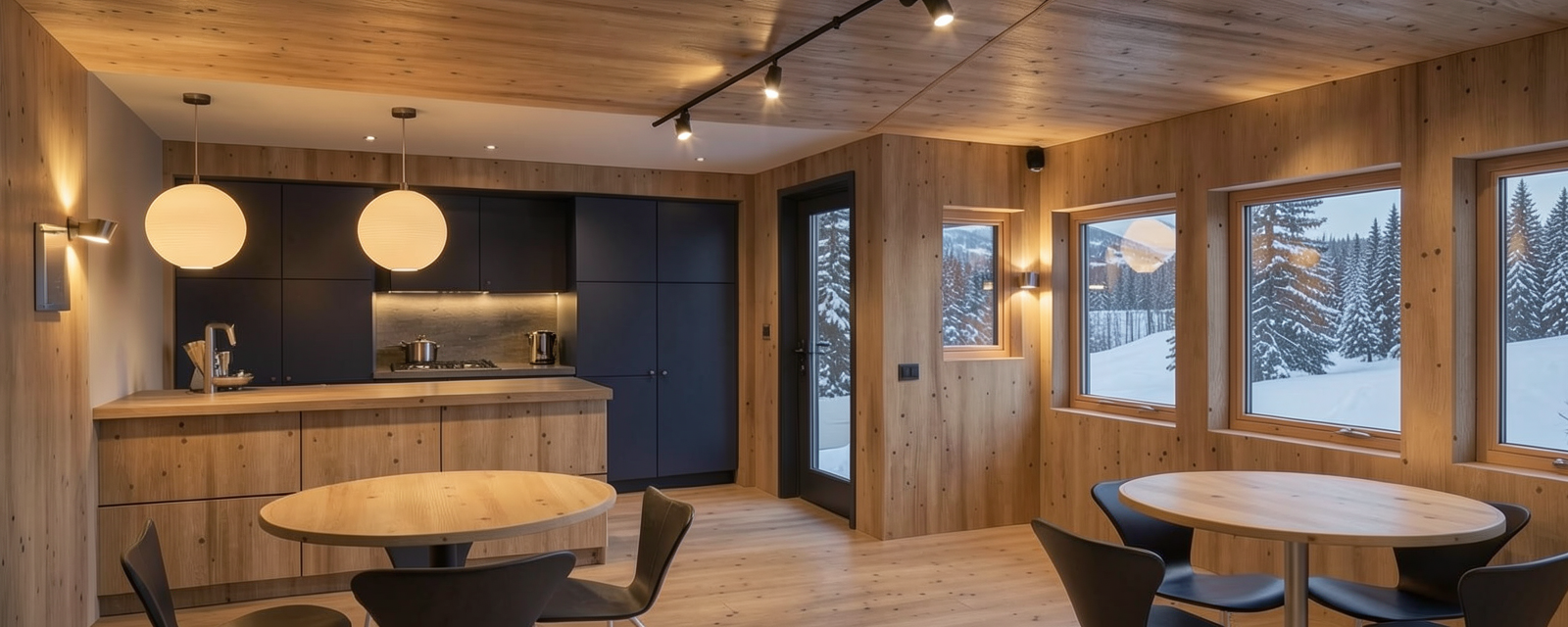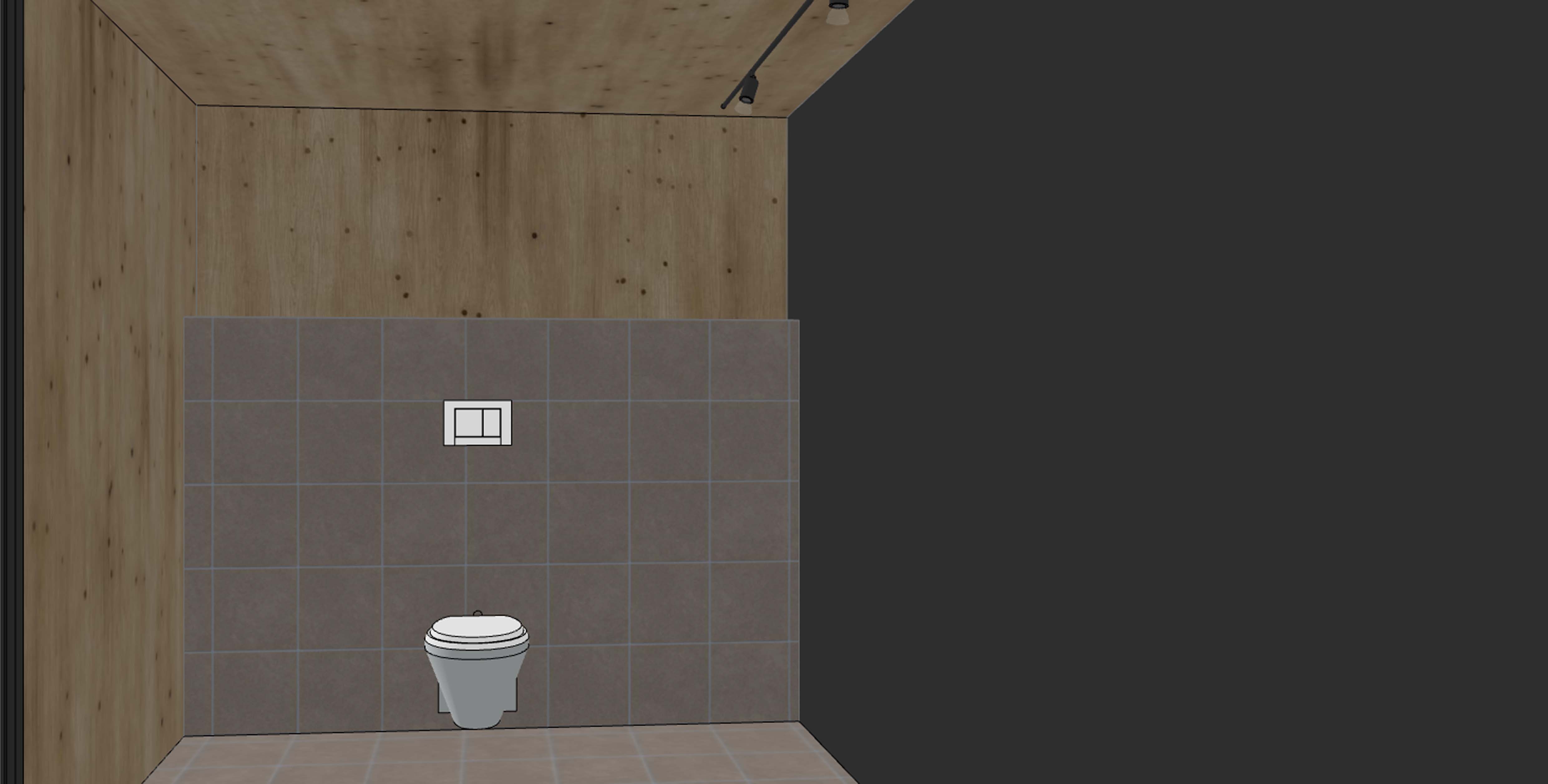 a warm modern restaurant toilet a toilet for handicap light tiles on the floor and up on the toilet wall dark contrast wall to the right and the rest in warm wood modern lamp on the wall and also spotlights in the ceiling a large sink in steel mounted on the black wall with a big mirror over
