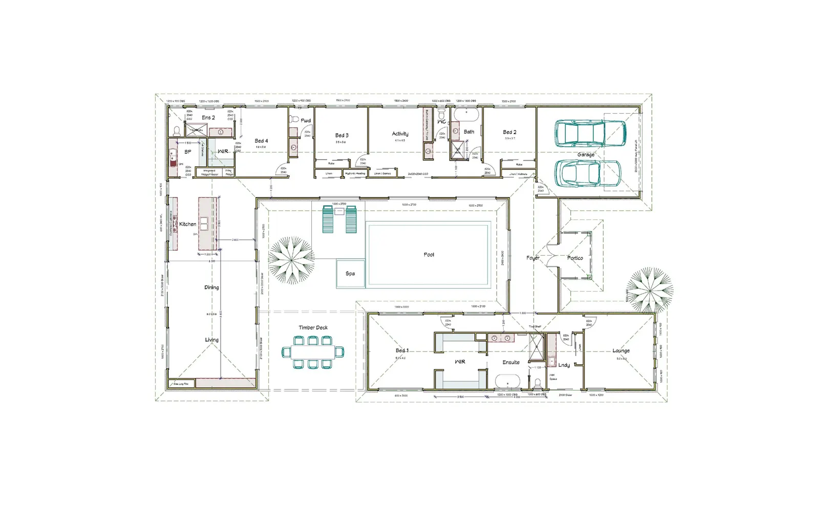 convert this floor plan into a minimal architectural presentation plan not a photorealistic rendering maintain the exact geometry wall thicknesses openings and layout from the original drawing do not change room sizes or wall positions style requirements non photorealistic architectural diagram clean black linework white background very subtle flat colour fills no textures or realistic materials visual treatment interior floors very light warm beige fill exterior courtyard light neutral grey pool water soft desaturated blue timber deck flat light tan colour no wood grain texture landscaping pale green fill lighting no dramatic lighting no realistic shadows only subtle wall shadow for depth furniture minimal schematic furniture only architectural diagram style important avoid photorealism avoid textures avoid real estate rendering style keep the drawing clean flat and suitable for an architectural presentation board