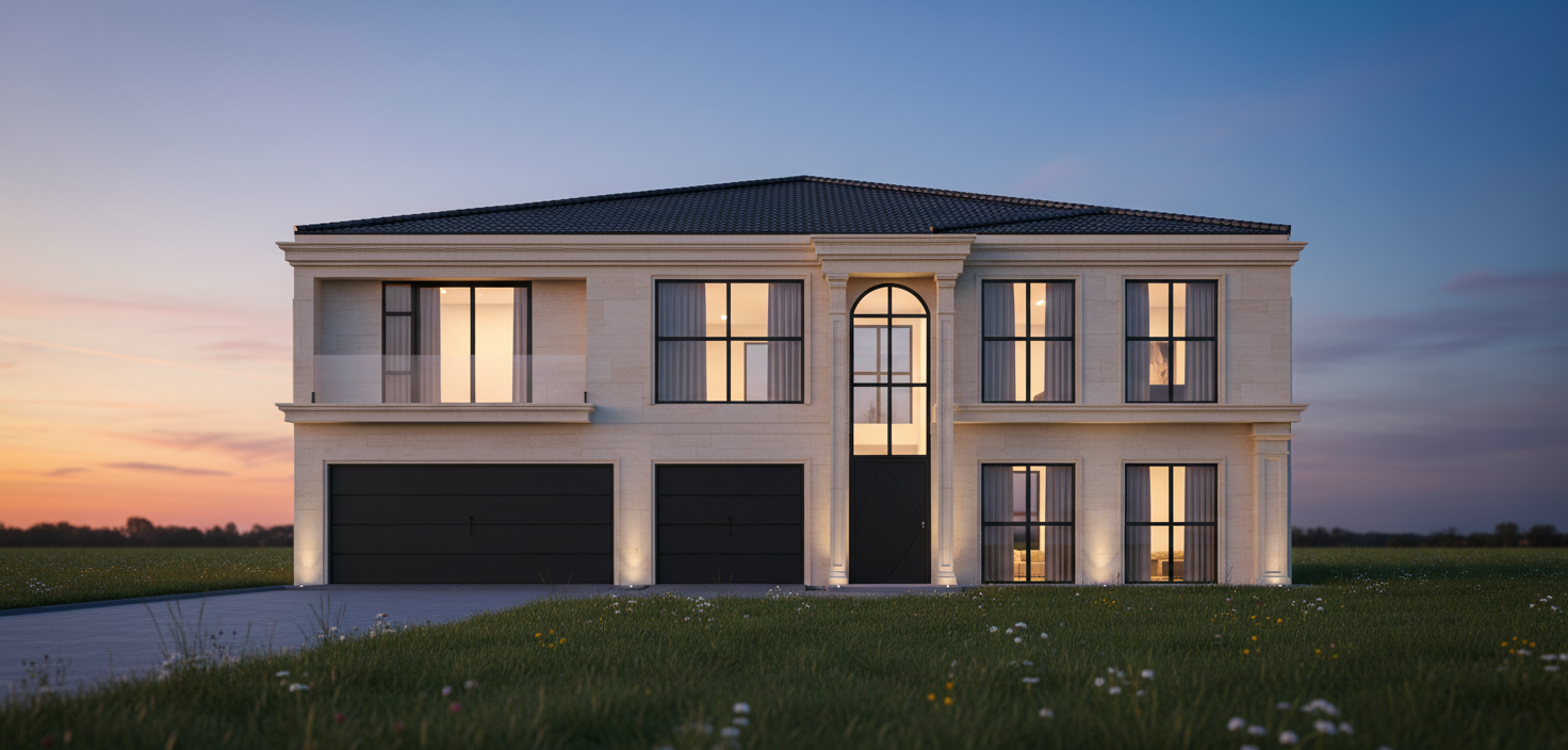 wide angle front view open black wrought iron gates in foreground shallow 20m depth to neoclassical house central paved roundabout with tiered fountain functional motor court loop connects gates to garage front right allocated for paved parking apron mature trees and lavender flanking sides only blue hour cinematic